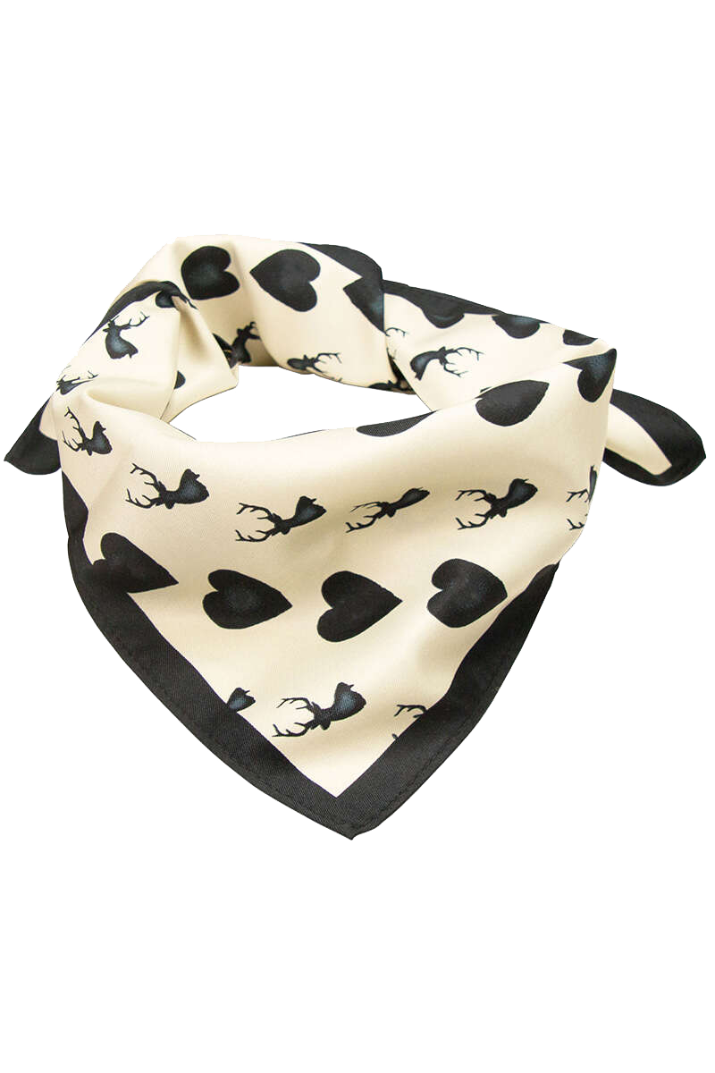 Ein luftig-leichtes Trachten-Nicki-Tuch der Marke Alpenflüstern mit einem einzigartigem Kreisel-Motiv aus Herzen und Hirschen in schwarz auf naturweißem Grund. Mit dem süßen, 50cm x 50cm großen Nickituch setzten Sie zum Dirndl oder zur Trachtenbluse modische Akzente.