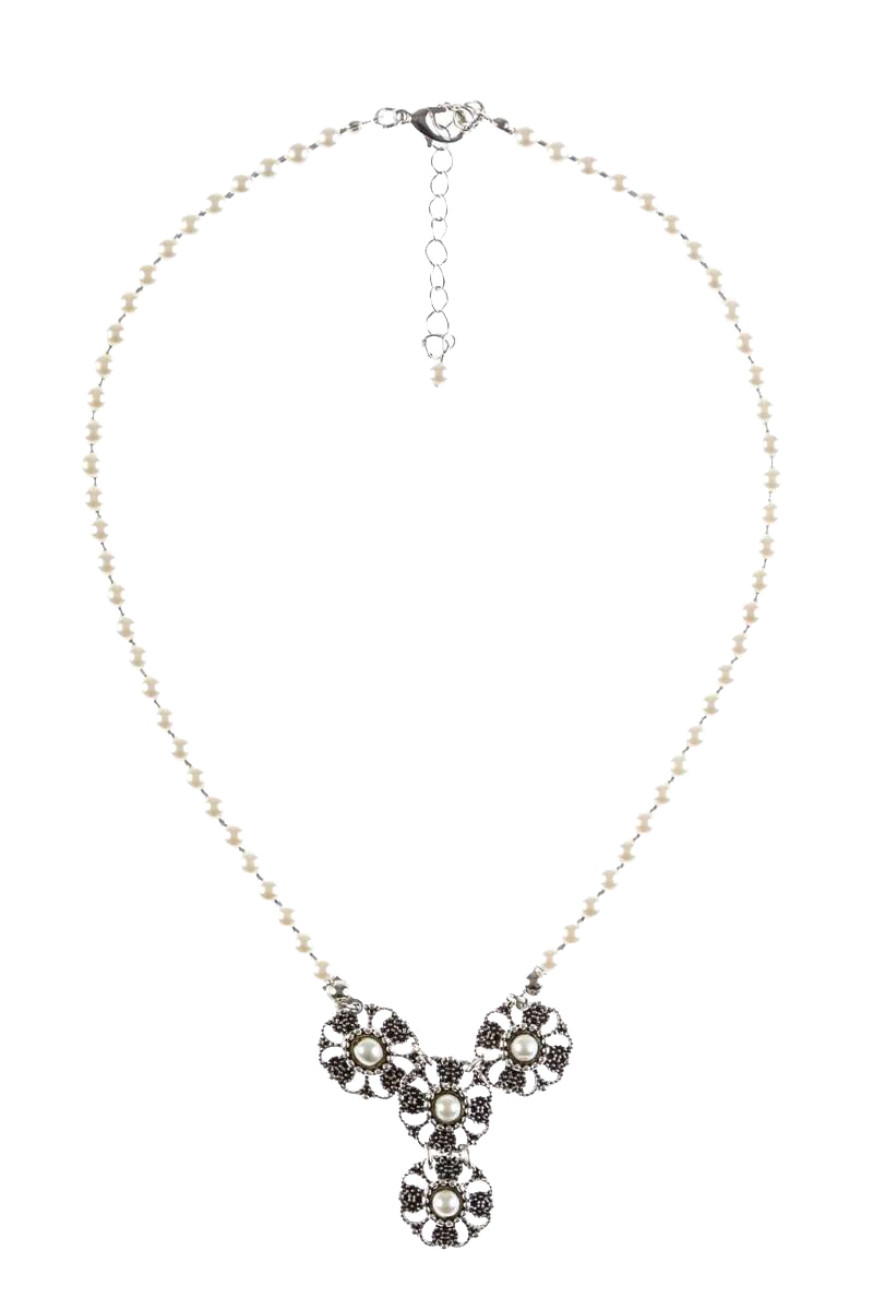 Diese edle Perlenkette rundet Ihr Trachtenoutfit perfekt ab. Die Blütenanhänger sind aufwendig gestaltet und mit je einer Perle in der Mitte versehen. Die cremefarbenen Perlen und die Anordnung der Blüten wirken sehr hochwertig. Die Kette ist ca. 41 cm lang und kann um 6 cm verlängert werden.