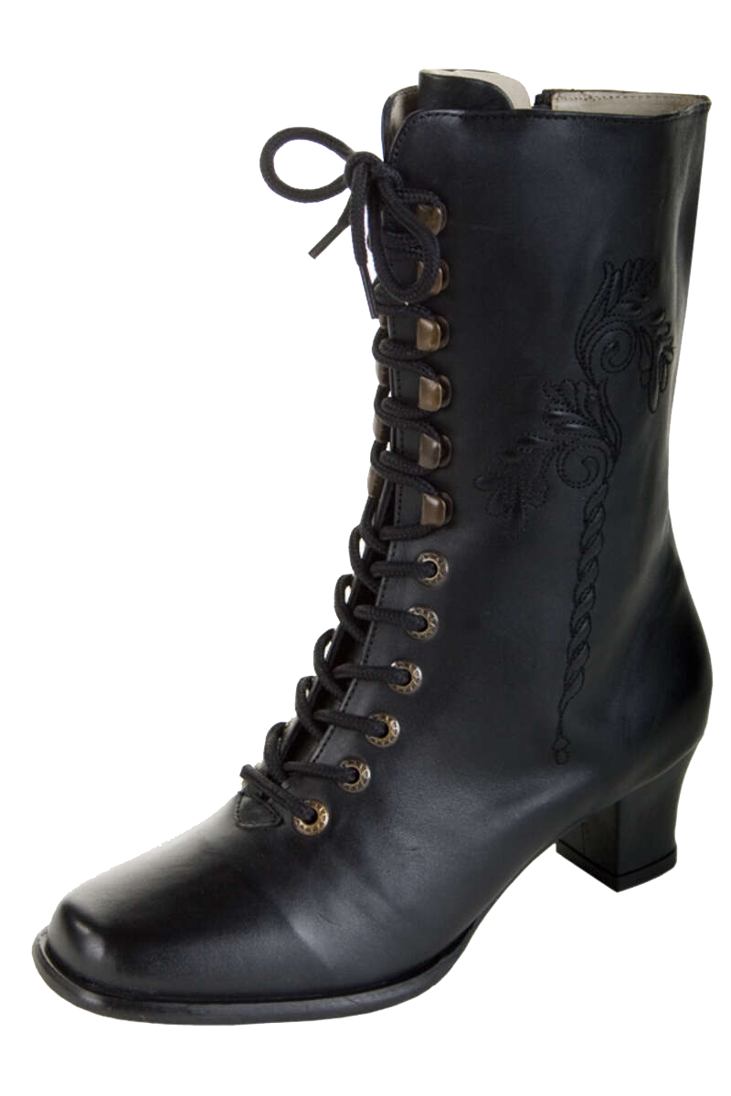 Eleganter Stiefel aus hochwertigem Rindnappaleder mit aufwändiger Ton-in-Ton Stickerei an der Schaftaußenseite.Geschlossen wird der Absatzstiefel mit einem Reißverschluss auf der Innenseite um den Einstieg zu erleichtern. Dieser absolut bequeme Stiefel kann zum Dirndl, Landhauskleid, aber auch super zur Jeans oder zum Rock getragen werden.