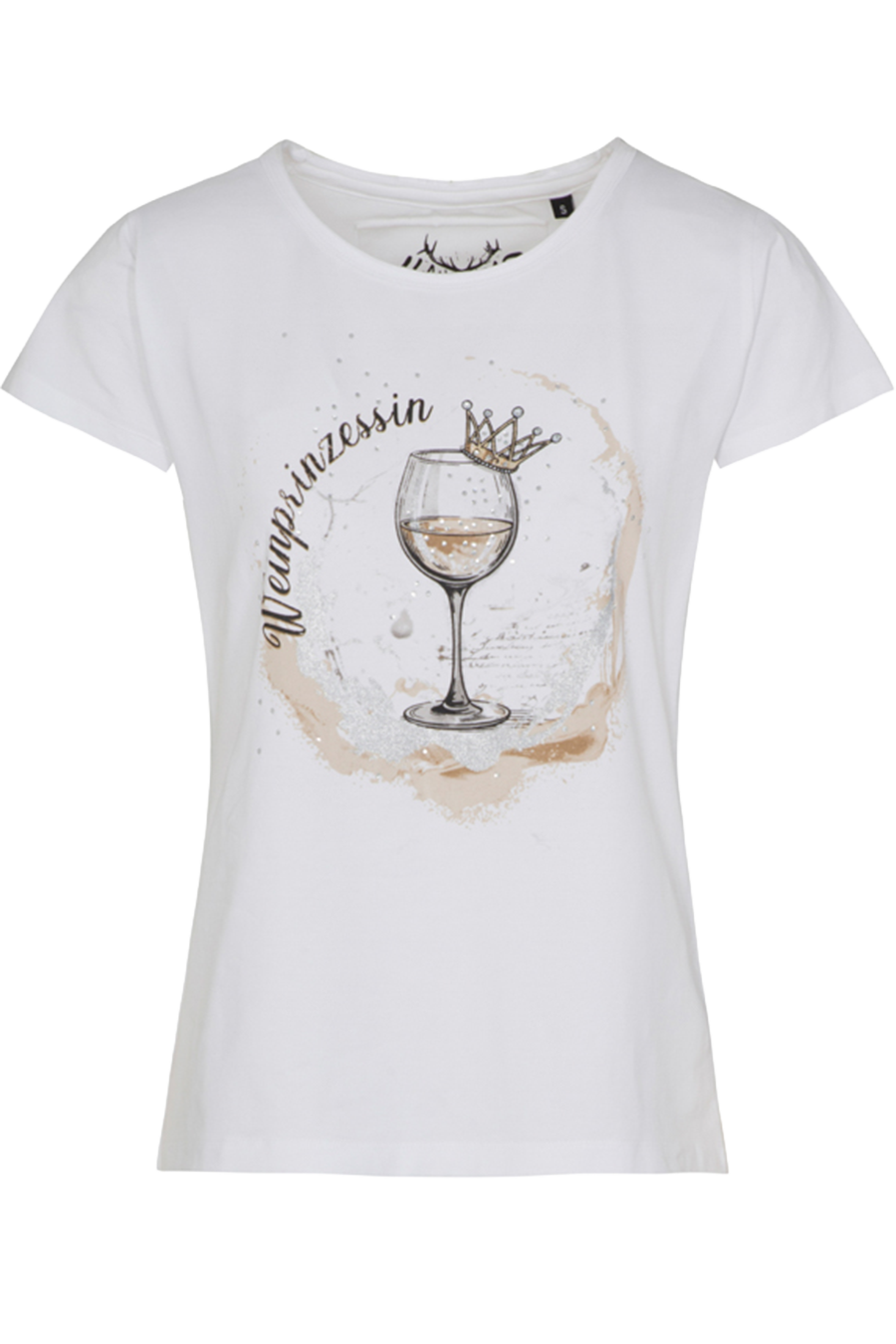 Der hochwertige Print zeigt ein Weinglas mit Krone, funkelnd umrahmt von Strasssteinen und Glitzerprint. Dazu der charmante Schriftzug „Weinprinzessin“, der sofort gute Laune verbreitet und das Shirt zum echten Hingucker macht.