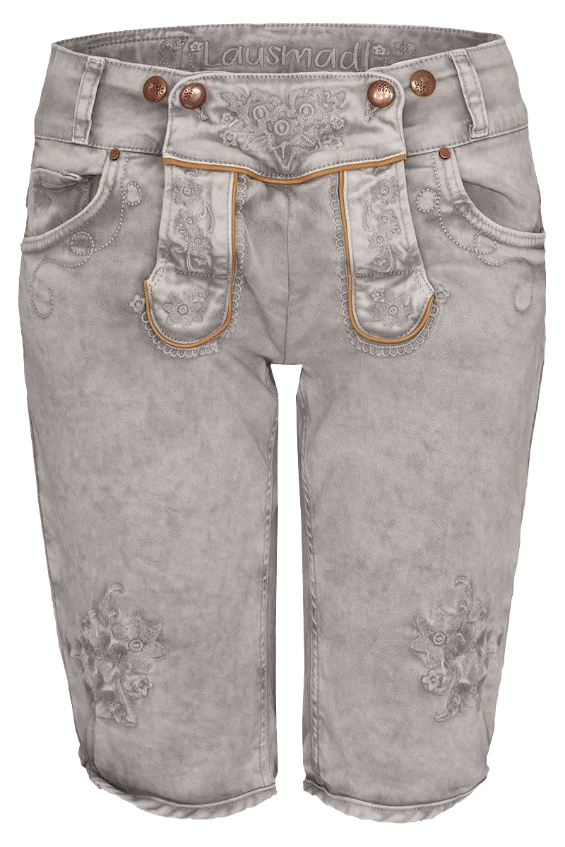 Bermuda-Short einmal ganz anders! Eine Damen-Short aus grauem Denim-Stoff mit dem typischen Hosenlatz einer Trachtenlederhose. Die Blumenstickerei an Latz und unterhalb der Einschubtaschen sowie der aufgestickte Hirsch auf der rechten Seite verstärken den trachtigen Eindruck. Die Aufschläge am Beinabschluss wie bei einer klassischen Bermuda-Short bilden hierzu einen aparten Kontrast.