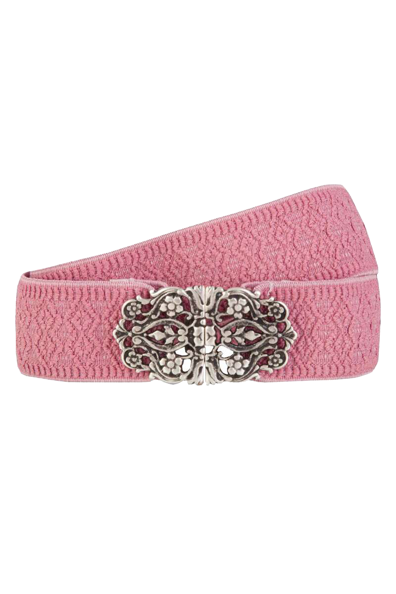 Dieser wunderschöne rosafarbene Damengürtel aus Elasthan ist das perfekte Accessoire zum Trachtenrock oder zur Jeans. Der 4 cm breite Gürtel ist mit einem Ethno- Muster versehen und wird mit einer Metallschließe geschlossen. Die silberfarbenen Verschlusshälften sind jeweils 4 cm hoch und 3,5 cm lang.