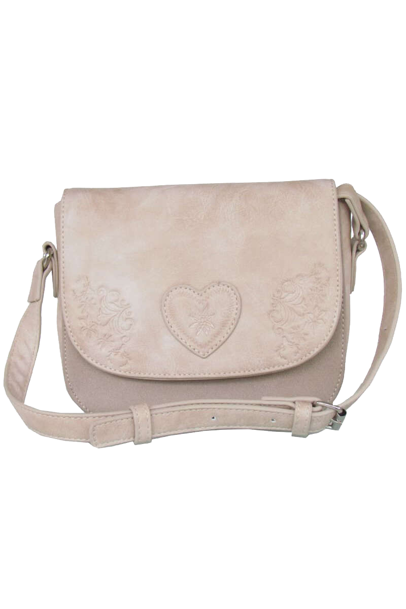 Diese schöne beige Trachten-Damen-Handtasche der Marke Lady Edelweiss ist in glatter Lederoptik gehalten und hat eine beige Frontseite in Veloursleder-Optik.Auf die Frontklappe, die mittels Magnetverschluss praktisch und sehr einfach geschlossen werden kann, ist ein beiges Herz aufgenäht, in das eine Edelweiss-Blüte eingeprägt ist. Auch neben dem Herz sind schöne verschnörkelte Verzierungen mit Blüten in die Tasche eingeprägt.Der lange Schulterriemen macht das längere Tragen dieser kleinen, dekorativen und eleganten Handtasche bequem und einfach.Mit dieser Handtasche entscheiden Sie sich für ein langlebiges Stück, das Sie gleichermaßen wunderbar zu Ihrer Tracht, aber auch im Alltag tragen können. Die Handtasche wird Sie überall schmücken und Sie über Jahre treu begleiten.