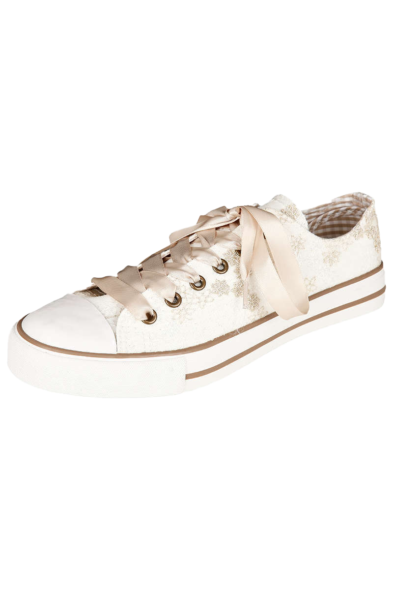 DER Trend für fesche Madln! Warum noch in unbequemen Pumps auf der Bierbank tanzen, wenn es auch bequem, aber trotzdem stylisch geht?Dieser Trachtensneaker ist einfach unerlässlich. Der Sneaker ist cool und bequem zugleich. Der Schuh ist in Weiß gehalten und an der Sohle mit zwei braunen Streifen geziert. Die Zunge und das Innenfutter des Schuhs ist in beige-weiß kariert gehalten. An der Außenseite des Sneaker sind filigrane Blüten in Weiß und Gold-Lurex-Fäden gestickt.Der Schuh verfügt über schlichte weiße und über beige Wechselschnürrsenkel.Der Sneaker kann sowohl zum Dirndl, als auch zur Jeans kombiniert werden und kann Sie so in nahezu allen Lebenslagen begleiten.