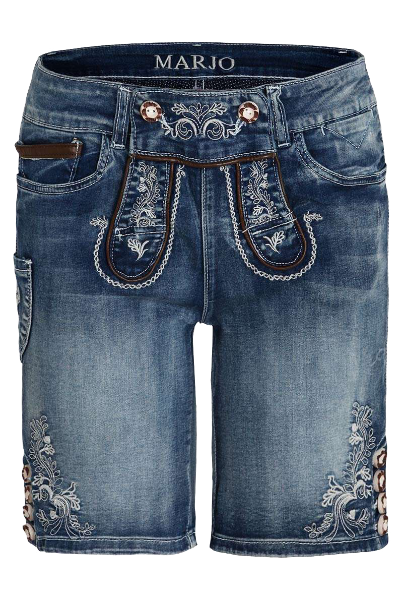 Franziska ist eine liebevoll gestaltete Bermuda-Jeans im Lederhosenstil. An Hosenlatz, Messertasche und Beinabschluss hebt sich die üppige weiße Stickerei effektvoll vom blauen Denim-Stoff ab, der in Washed Optik gehalten ist. Eine Besonderheit sind die Knopfleisten am Beinabschluss, die durchknöpfbar sind, so dass sie geöffnet werden können. Weitere Features sind die Trachtenknöpfe und die Einfassungen in Lederoptik an der Uhrentasche und dem Latz.
