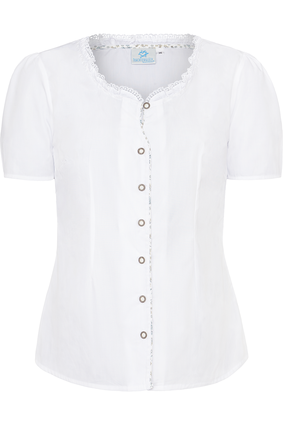 Der runde Ausschnitt ist mit zarten Rüschen und einer feinen Spitzenbordüre verziert und verleiht der Bluse eine romantische Note. Die durchgehende Knopfleiste mit Knöpfen in edler Hornoptik unterstreicht den traditionellen Charakter und sorgt für ein harmonisches Gesamtbild.