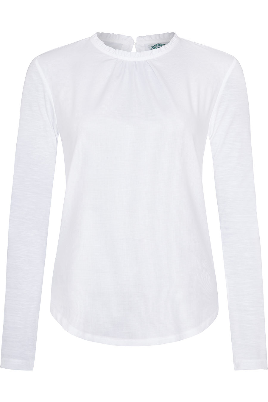 Der runde Halsausschnitt ist vorne in feine Fältchen gelegt und mit zarten Rüschen verziert, was der Bluse eine besonders feminine Note verleiht. Ein Tropfenverschluss im Nacken setzt einen dezenten, eleganten Akzent. Die Vorderseite aus strukturiertem Webstoff sorgt für eine edle Optik, die Rückseite sowie die langen Ärmel aus weichem Jerseymaterial garantiert maximale Bewegungsfreiheit.