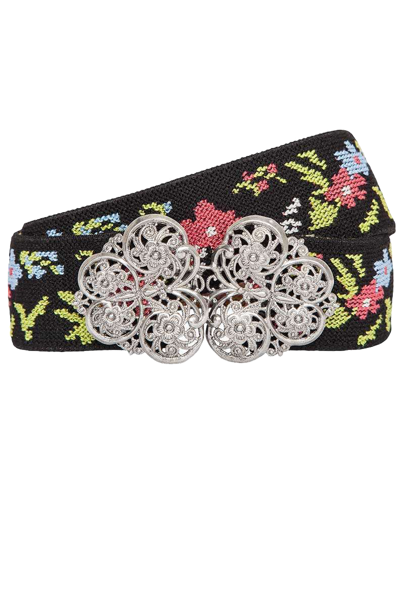 Der in Schwarz mit buntem floralem Webmuster gehaltene Damengürtel aus Elasthangewebe ist ein perfektes Accessoire zu einem Trachtenrock oder auch zur Jeans. Der 4 cm breite Gürtel ist bunt gemustert und wird mit einer Metallschließe geschlossen. Die silberfarbenen Verschlusshälften sind jeweils 5 cm hoch und 4,5 cm lang.