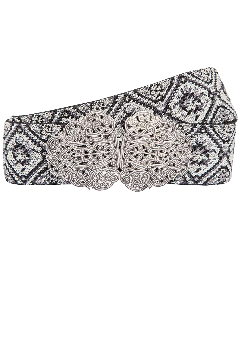 Der in Dunkelgrau und Silber gehaltene Damengürtel aus Elasthangewebe ist ein perfektes Accessoire zu einem Trachtenrock oder auch zur Jeans. Der 4 cm breite Gürtel ist kariert gemustert und wird mit einer Metallschließe geschlossen. Die silberfarbenen Verschlusshälften sind jeweils 5 cm hoch und 4,5 cm lang.