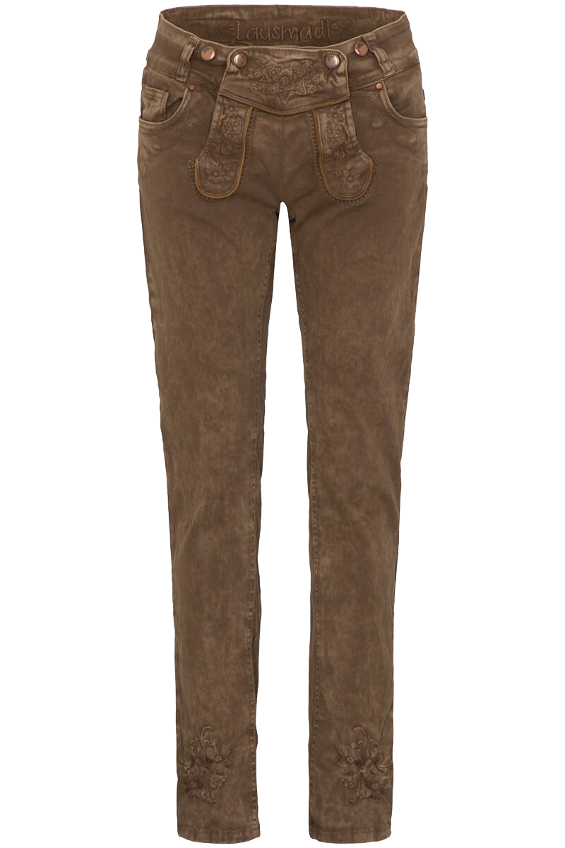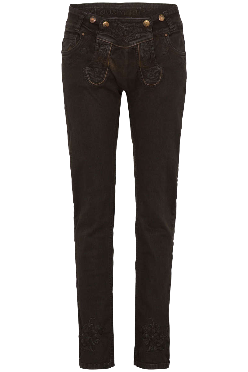 Eine Damen-Trachtenjeans aus dunkelbraunem Denim-Stoff mit dem typischen Hosenlatz einer zünftigen Trachtenlederhose. Die Blumenstickerei an Latz und unterhalb der Einschubtaschen sowie der aufgestickte Hirsch auf der rechten Seite verstärken den trachtigen Eindruck. Modisch, frech und ein absoluter Hingucker.