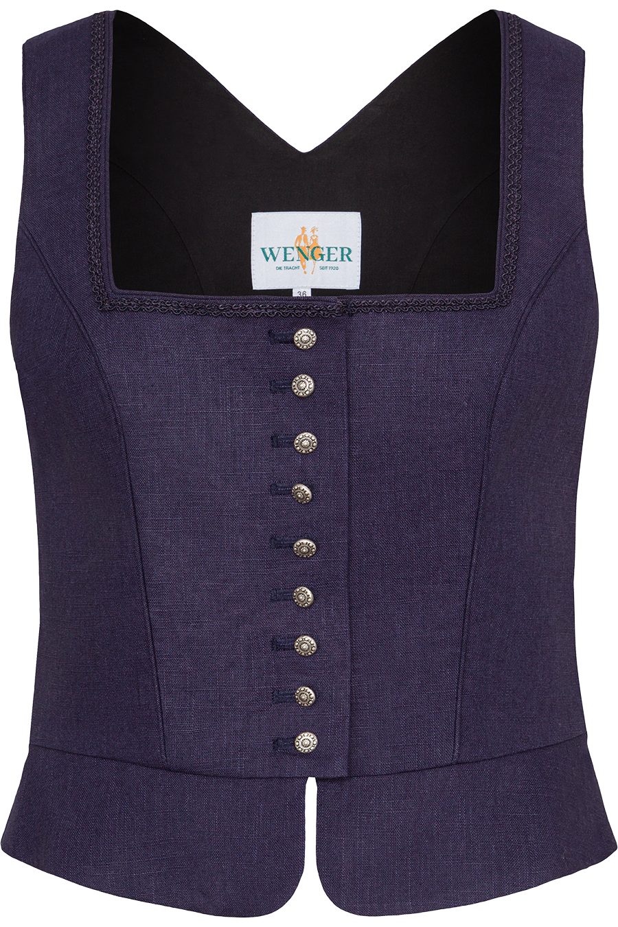 Der hohe Leinenanteil verleiht dem Mieder seine charakteristische, natürliche Materialstruktur und sorgt zugleich für ein angenehmes Tragegefühl. Der eckige Ausschnitt wird durch eine feine Zierborte geschmackvoll betont und setzt das Dekolleté stilvoll in Szene. Entlang der Knopfleiste sorgen aufwendig verzierte Knöpfe für einen edlen, traditionellen Look.