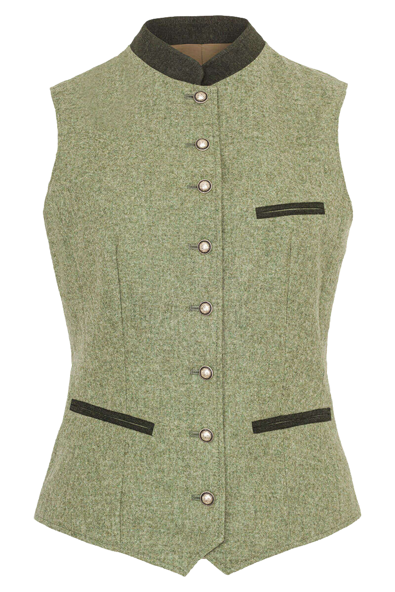 Die hochwertige Damen-Trachtenweste der Marke 'Apple of my eye' in edlen Grüntönen ist aus feinem Loden gefertigt. Das helle Lindgrün harmoniert hervoragend mit dem dunklen Tannengrün, mit dem der kleine Stehkragen und die Tascheneinfassungen gefertigt sind. Die Weste ist tailliert und körpernah geschnitten und mit klassischen Elementen ausgestattet, wie zwei vorderen Einschubtaschen und einer Brusttasche. Die schön verzierten Kugelknöpfe aus Metall sorgen für einen edlen Auftritt. Der Rücken ist schlicht gehalten. Das moosgrüne Futter schafft ein angenehmes Tragegefühl.