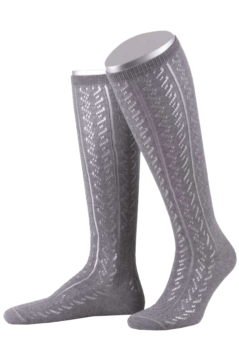 Feiner Damenkniestrumpf mit Ajourmuster in einem schönen Grauton. Dieser Strumpf zeichnet sich durch ein angenehmes Tragegefühl und eine besonders gute Paßform aus. Der ideale Sommerstrumpf passend zum Dirndl.