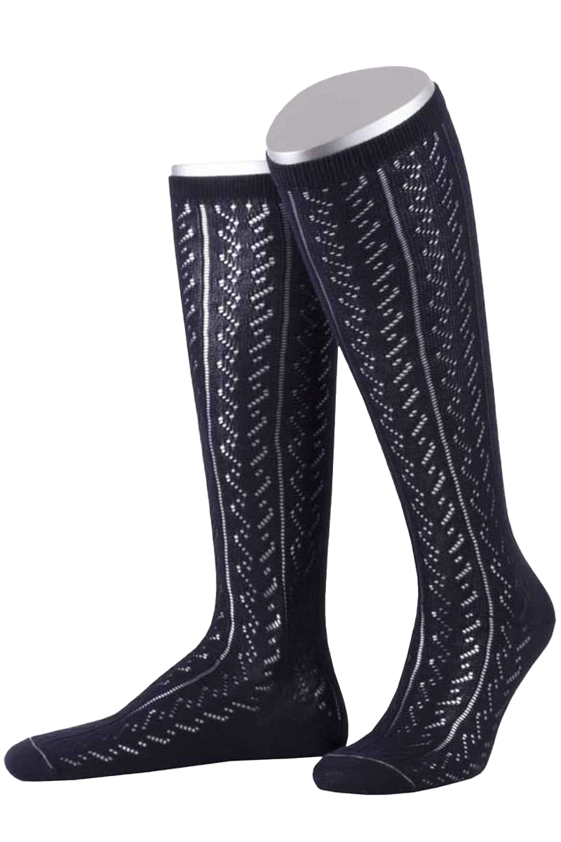 Feiner Damenkniestrumpf mit Ajourmuster in marine. Dieser Strumpf zeichnet sich durch ein angenehmes Tragegefühl und eine besonders gute Paßform aus. Der ideale Sommerstrumpf passend zum Dirndl.