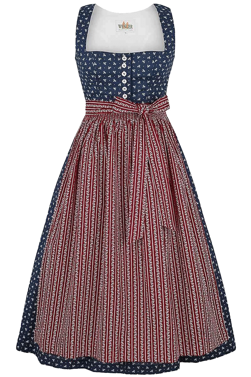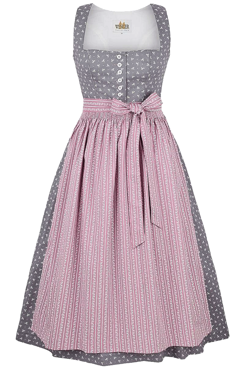 Produktinformationen:Dieses sehr traditionelle und bezaubernde Dirndl der Marke Wenger ist mit vielen klassischen Details ausgestattet. Das traditionelle Streublumenmuster harmoniert gut mit dem geradlinigen Schnitt. Das Dirndl verfügt über eine Knopfleiste mit Perlmuttknöpfen in der vorderen Mitte.Die Gesamtlänge von der Schulternaht ab bis zum Rocksaum beträgt bei Größe 36 123 cm.Oberteil:Das Oberteil ist in Grau gehalten und mit einem filigranen, weißen Streublumenmuster geziert. Der Ausschnitt des Dirndls ist als eckiger Balkonettausschnitt gearbeitet und verleiht dem Dirndl einen nostalgischen Charakter. Der Ausschnitt und die Abnäher am Oberteil sind mit grauen Paspeln geziert.Rock:Der Rock des Dirndls ist, wie das Oberteil, in Grau gehalten und ebenfalls mit filigranen, weißen Streublumen gemustert. In den Rock ist auf der rechten Seite eine Einschubtasche eingearbeitet.Die Rocklänge bei Konfektionsgröße 36 beträgt ca. 79 cm.Schürze:Die Schürze des Dirndls ist in Rosa gehalten. Sie ist mit einem linearen Muster versehen. Durch den traditionellen Look ist das Dirndl ein echtes Vintage Dirndl.