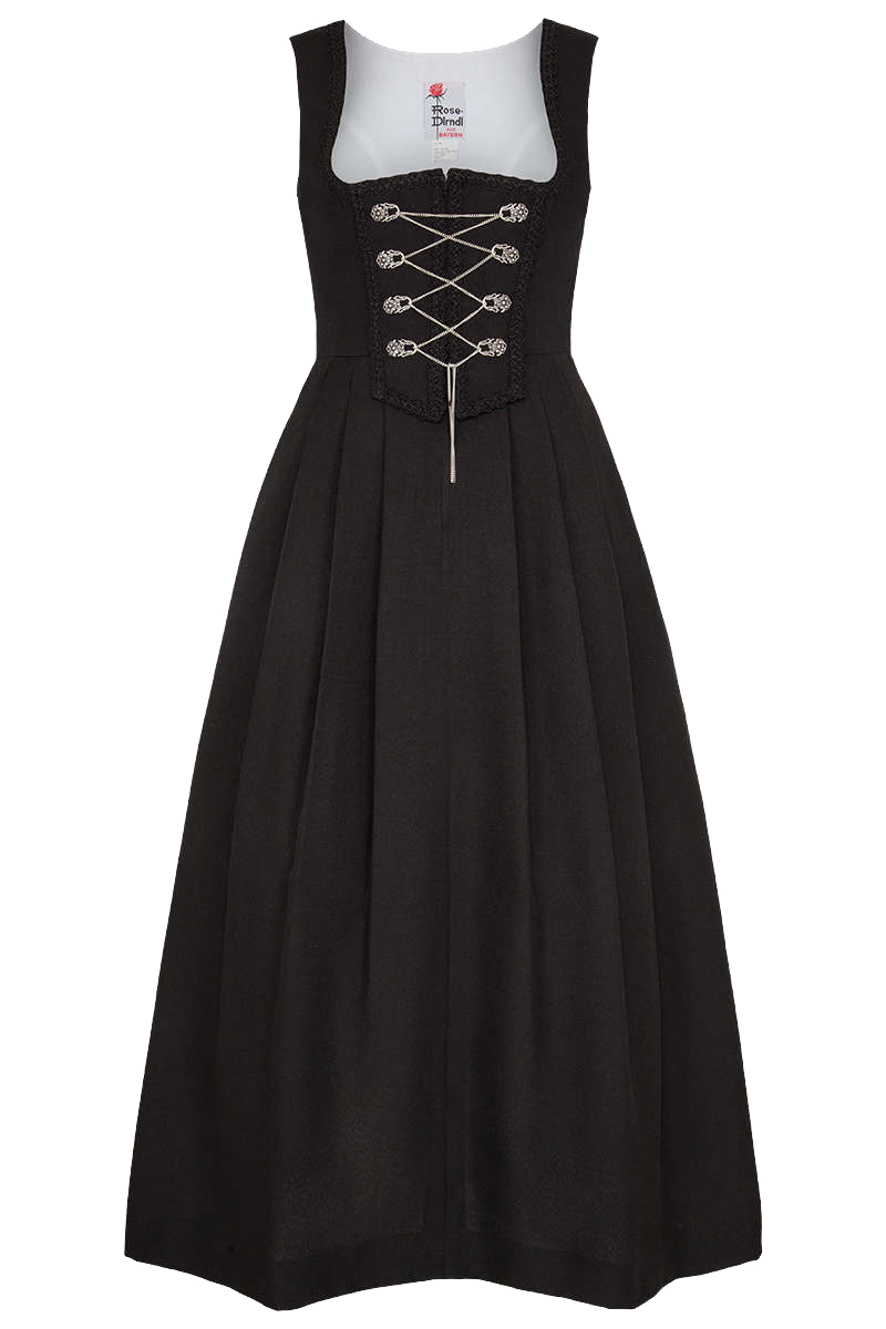 Dieses Dirndl besticht durch seine schlichte Eleganz und kleine aufeinander abgestimmte liebevoll gestaltete Details. Das Oberteil des Dirndls ist in schwarz gehalten und mit einer abgesetzten schwarzen Bordüre versehen. Der Ausschnitt ist ebenfalls mit einer schwarzen Bordüre gesäumt. Die Miederhacken sind elegant gestaltet. Passend hierzu gehört zum Dirndl eine Miederkette. Der Rock des Dirndls ist ebenfalls schwarz. Rocklänge bei Gr. 36: 93 cm. Im Rock ist eine praktische Tasche eingenäht. Darin lassen sich wichtige Dinge wie Lippenstift, Geld und Ausweis sicher verstauen. Das Dirndloberteil wird vorne mit einem Reißverschluss geschlossen.Durch seine schlichte Eleganz ist es mit jeder Farbe kombinierbar und deswegen für jeden Anlass die richtige Wahl.Vergessen Sie auch nicht einen Dirndl-BH. Denn erst ein spezieller Dirndl-BH unterstützt Ihr Dekolleté vorteilhaft und verschafft dem Dirndl einen guten Sitz. Wir empfehlen hierzu den Dirndl-BH 'Betty'.Dirndlbluse und Dirndl-BH nicht im Lieferumfang enthalten.