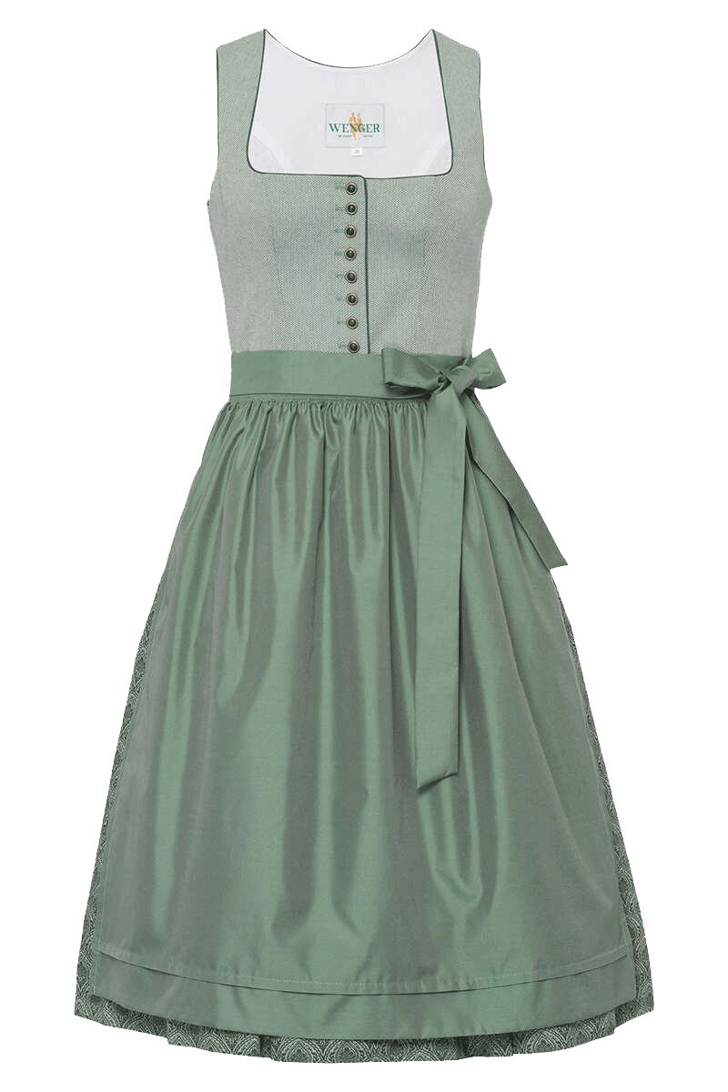 Ein zeitloser Klassiker ist dieses zauberhafte Dirndl SANDRA der Marke Wenger in salbei. Durch die schlichte, aber elegante Farbkombination ist dieses lange Dirndl vielseitig kombinierbar und passt zu jedem Anlass.Das Oberteil besteht zum größten Teil aus hochwertiger Baumwolle und ist am eckigen Halsausschnitt, an den Armausschnitten und an der Knopfleiste mit einer schmalen dunkelgrünen Paspel eingefasst. Eine Besonderheit sind die Knöpfe am Mieder, die im gleichen Grün gehalten sind und eine silberfarbene Einfassung haben. Der Rock besteht aus reiner Baumwolle, so dass das Dirndl auch an wärmeren Tagen angenehm zu tragen ist. Durch das verspielte Muster verleiht der Rock dem Dirndl eine fröhliche Ausstrahlung. Besonders edel wirkt die grün schimmernde Schürze, die das Dirndl perfekt ergänzt.Der Rock ist in Größe 36 ca. 80 cm lang und hat auf der rechten Seite eine Seitentasche.