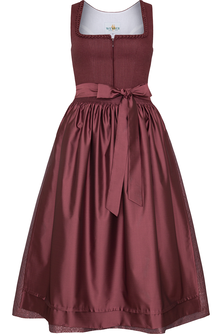 Abgerundet wird das Dirndl durch eine einfarbige, farblich abgestimmte Schürze mit Bindeband, die durch ihren Glanz einen stilvollen Akzent setzt – ein echter Blickfang bei jedem Anlass.