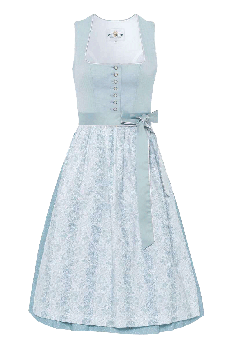 Das lange Dirndl FLAVIA von Wenger besticht durch seine schlichte Eleganz und die vielen feinen Verzierungen. Der Oberstoff des hellblauen Oberteils ist mit einem feinen Fischgrätenmuster veredelt. Die traditionelle Wiener Naht sorgt für eine figurnahe Silhouette. Der Karreeausschnitt des hellblauen Oberteils und die Ärmelenden sind mit Paspeln in einem hellen Roséton und einem dunkleren Blauton eingefasst. Die edlen Metallknöpfe in heller Perlmuttoptik veredeln den Look. Der Rock ist mit kleinen Punkten bedruckt, die wie Blümchen aussehen. Der Rock besteht aus 100% Baumwolle und ist verspricht somit ein angenehmes Tragegefühl. Auf der rechten Seite befindet sich eine Einschubtasche. Die lebhafte Farbe des Dirndls findet sich auch im Paisleymuster mit linearen Blumenranken auf der weißen Schürze, die fein bedruckt ist. In die schimmernden Bänder der Schürze sind rosa Paspeln eingearbeitet, welche das Design perfekt abrunden.Bei der Konfektionsgröße 36 beträgt die Rocklänge ca. 80 cm.