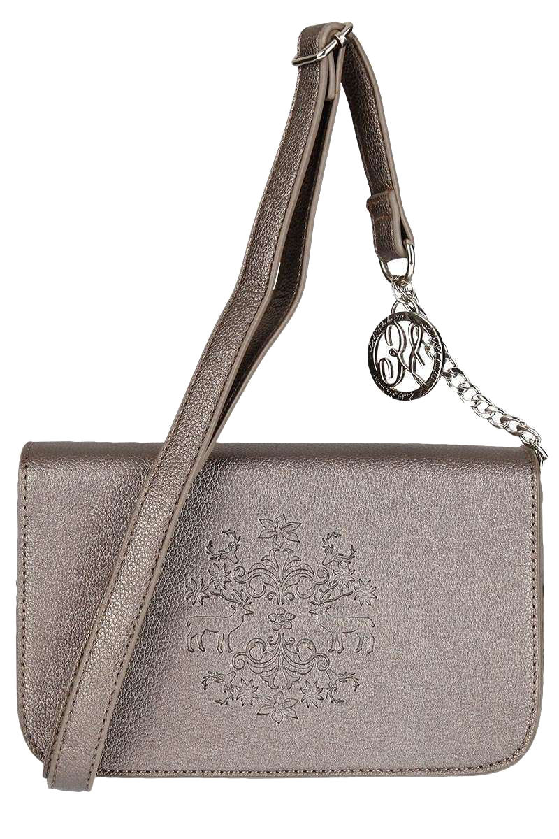 Die hellbronzefarbene Umhängetasche hat einen ca. 125 cm langen, variablen Umhängeriemen, der als Besonderheit im unteren Bereich glänzende Gliederketten aufweist. Die bis an den Taschenboden reichende Verschlussklappe ist mit einer Prägung aus Hirschen und Blumenranken geschmückt. Innen sorgen eine Handytasche und eine Reißverschlusstasche für Übersicht. HxBxT = 14x22x8 cm