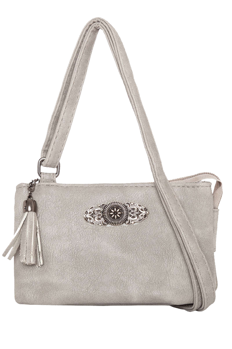 Die kleine Umhängetasche in Grau von P.S. Schuhmacher zeichnet sich durch ein besonders aufwändig gearbeitetes Innenleben aus. Drei Einzelfächer und 6 Einschübe für diverse Scheckkarten sorgen für Ordnung selbst bei den kleinen Außenabmessungen von 16 cm (B) x 11 cm (H) x 3,5 cm (T) im leeren Zustand. Den äußeren Reißverschluss ziert eine Quaste mit Metallknopf. Ein weiteres Schmuckelement aus Altsilber befindet sich an der Außenseite. Der circa 140 cm lange Tragriemen ist einstellbar.