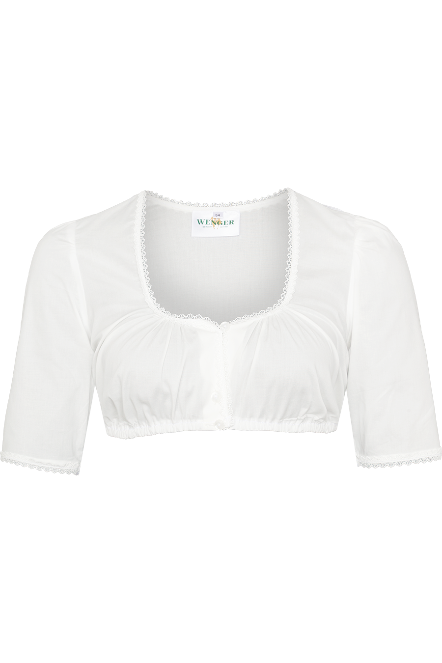 Die elastische und blickdichte Dirndlbluse NAOMI von Wenger verleiht jedem Dirndl eine zarte, feminine Note. Das florale Stickereiband am Herzausschnitt und an den Armabschlüssen setzt elegante Akzente, während die gepufften, kurzen Ärmel einen Hauch verspielter Romantik versprühen.