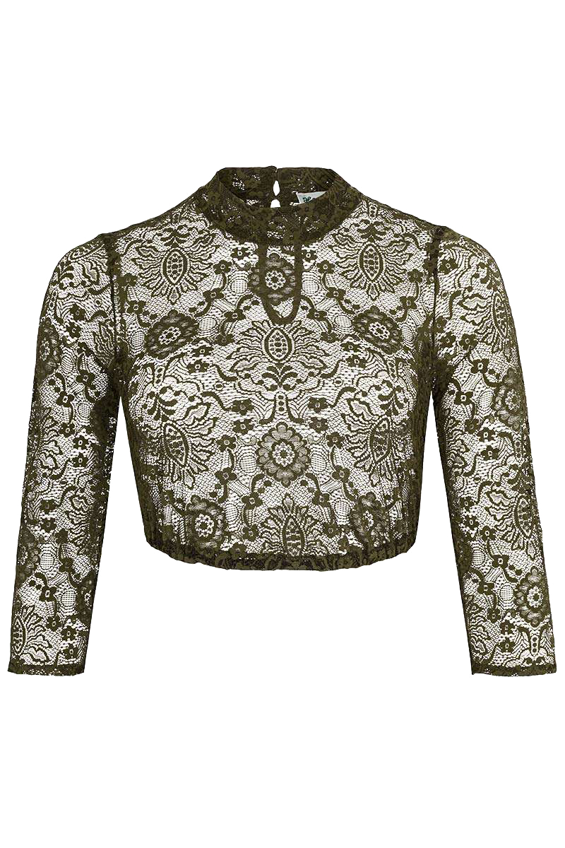 Die dunkelgrüne Dirndlbluse BABSI von Hammerschmid besticht durch ihre hochwertige Spitze mit Stretchanteil. Mit der Dirndlbluse wird jedes traditionelle Dirndl im Handumdrehen modern interpretiert. Auch der angesagte Ton-in-Ton-Look lässt sich mit einem gleichfarbigen Dirndl kreieren.Die Spitze ist mit einem Ornamentmuster versehen, das durch kleine Blümchen aufgelockert wird. Der hochgeschlossene Ausschnitt wird hinten geschlossen und wirkt mit dem Stehkragen besonders modern. Die 3/4-Ärmel eignen sich sowohl für wärmere als auch für kältere Tage. Das Material aus Polyamid ist sehr angenehm zu tragen und langlebig. Durch den Elasthananteil passt sich die Bluse perfekt an den Körper an. Der Gummizug am Saum sorgt für einen rutschfesten Sitz.