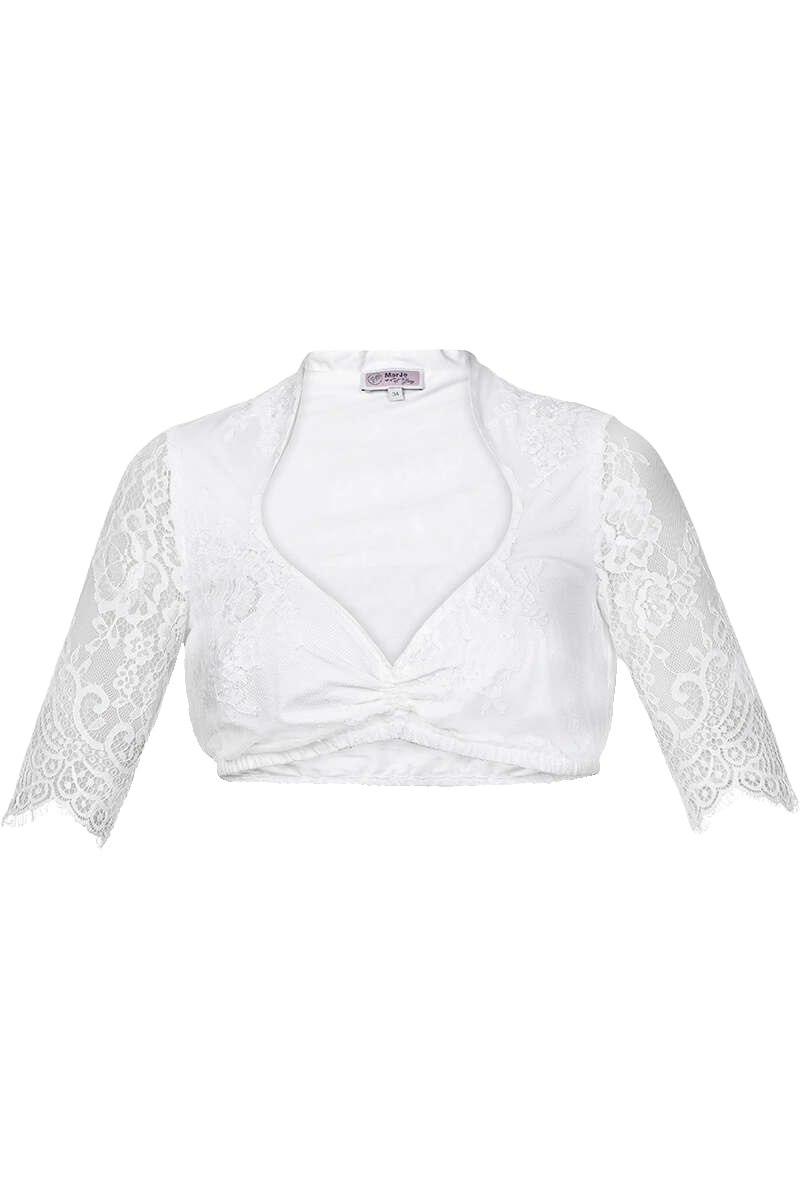 LEONA-ELENA ist eine fesche Dirndl-Spitzenbluse der Marke MarJo in weiß. Während die halblangen anliegenden Ärmel aus floraler Spitze transparent bleiben und mit süßen kurzen Fransen wellenförmig abschließen, sind Brust und Rücken mit einem weißen angenehm zu tragendem elastischem Jerseystoff unterlegt. Besonders apart ist der Stehkragen, der in einen großzügigen Herzausschnitt mit Raffung übergeht. Dank verdeckter innenliegender Bändchen lässt sich je nach Stärke der Raffung die Ausschnitttiefe variieren.