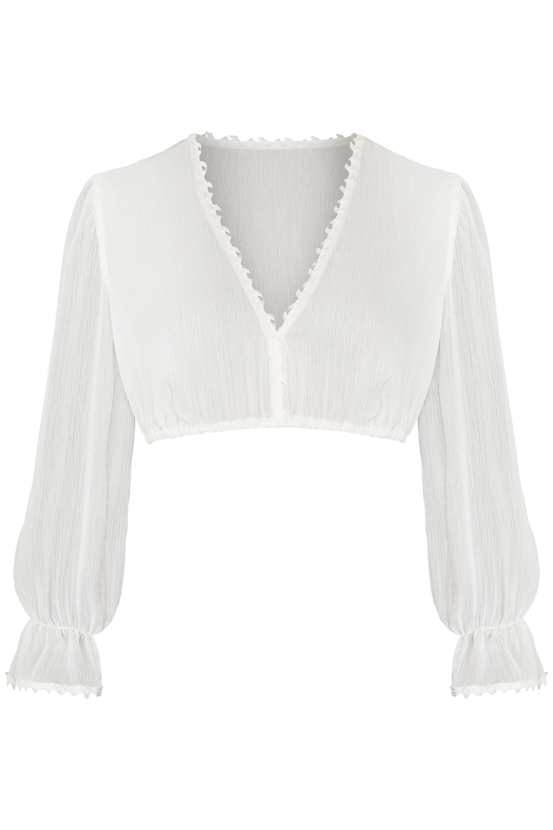 Die cremeweiße Dirndlbluse KAJA von Wenger liegt mit ihren langen, weiten Ärmeln voll im Trend. Sie lässt sich wunderbar zu verschiedenen Dirndln kombinieren und zaubert einen romantischen Look. Besonders bei festlichen Anlässen wertet die leicht durchscheinende Bluse das Gesamtbild auf und lässt Sie strahlen!Der V-Ausschnitt, der Kragen und die Ärmelenden sind mit einer schönen Spitzenborte eingefasst. Die Ärmel sind weit geschnitten und fallen locker. Die Ärmelenden sind mit einem Gummizug versehen, so dass die Ärmel nicht verrutschen und ein schönes Volumen entsteht.Der Gummizug am Saum sorgt für einen perfekten Sitz der Bluse.