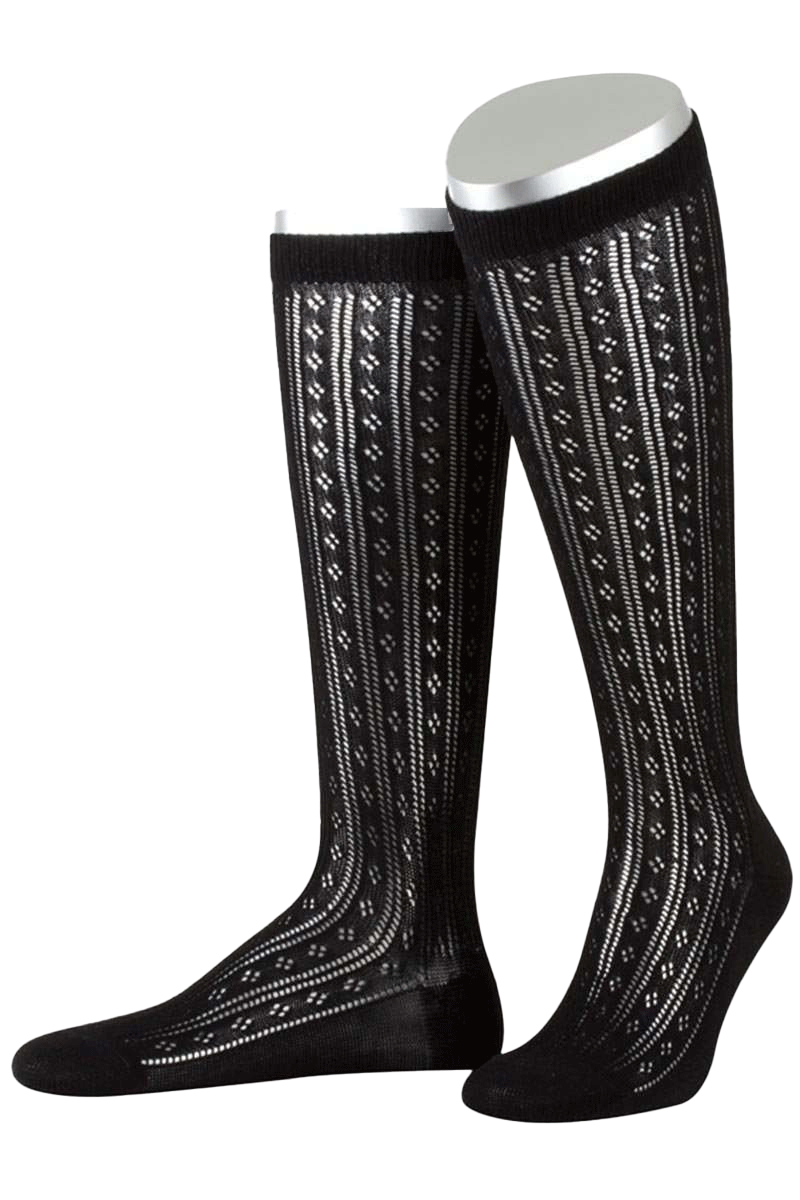 Das feine Ajourmuster und das leicht glänzende Material (durch Verwendung von 90% mercerisierter Baumwolle macht diesen Damenkniestrumpf (Dirndlstrumpf) besonders chic. Ferse und Spitze ist verstärkt, dies garantiert eine lange Haltbarkeit und ein angenehmes Tragegefühl. Dieser Strumpf passt perfekt zur Tracht, kann aber auch sehr gut zu allen anderen Outfits getragen werden.