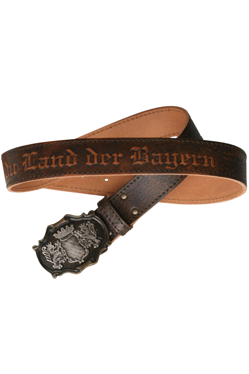Vielseitig kombinierbarer Ledergürtel aus robustem Büffelleder. Im Leder ist hinten die erste Zeile der Bayernhymne "Gott mit dir, du Land der Bayern" eingeprägt. Die Schnalle ist altmessing mit dem Bayern-Wappen in altsilber.Der Gürtel ist 4cm breit.