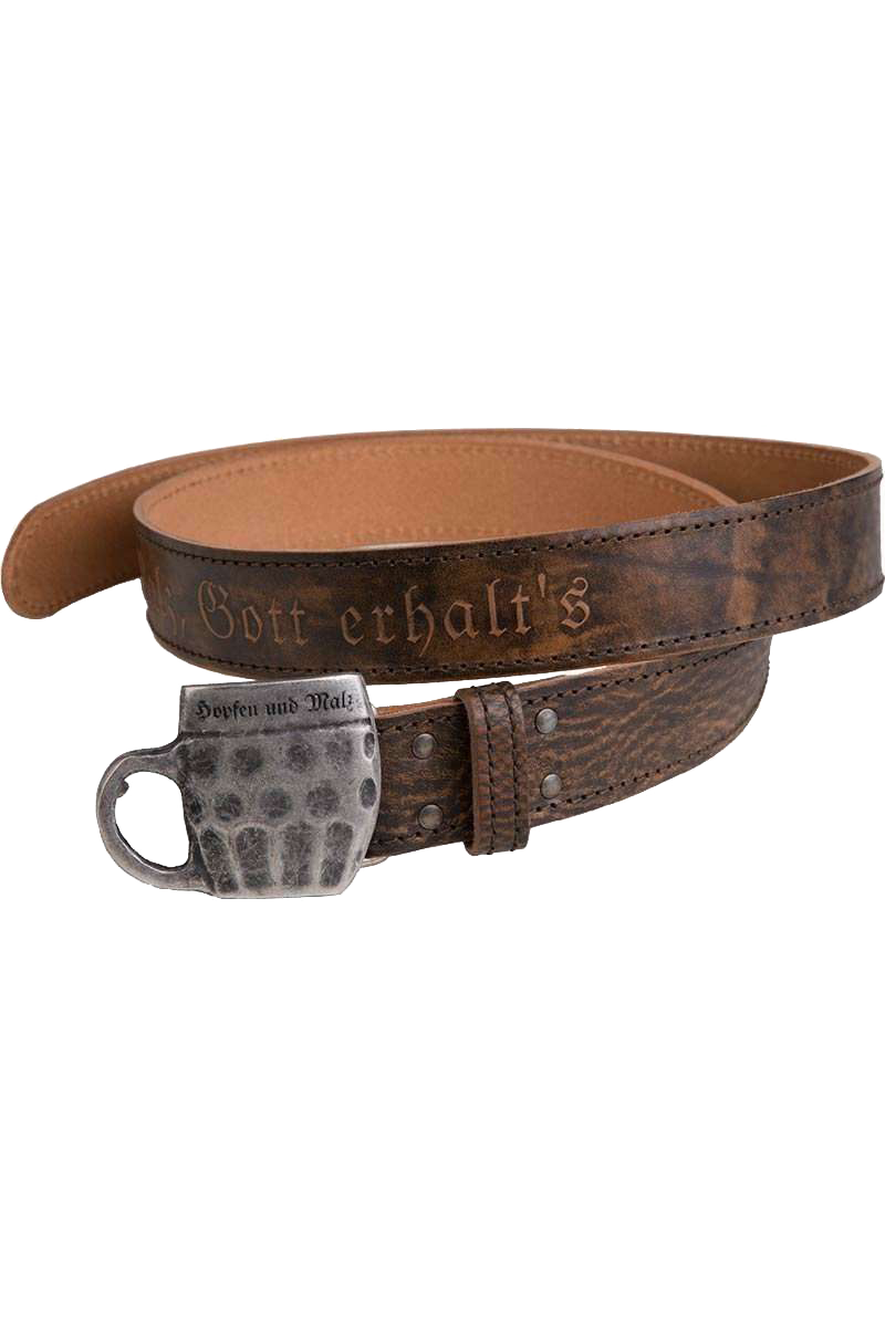 Dieser auffällige Ledergürtel ist vielseitig kombinierbar. Die Schnalle hat die Form eines Bierkruges und ist mit dem Schriftzug „Hopfen und Malz" versehen. Auf dem Gürtel ist ein erhabener Schriftzug angebracht. Darauf ist zu lesen „Hopfen und Malz, Gott erhalt's". Der Gürtel ist 4cm breit.