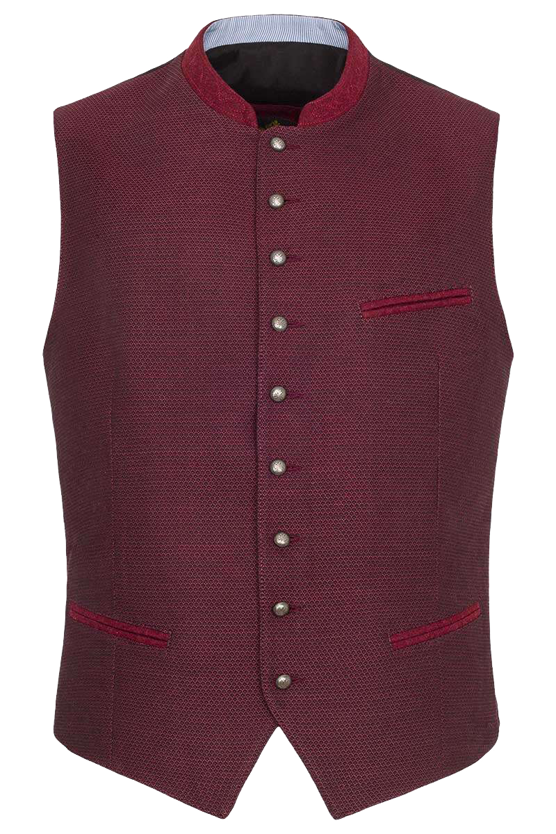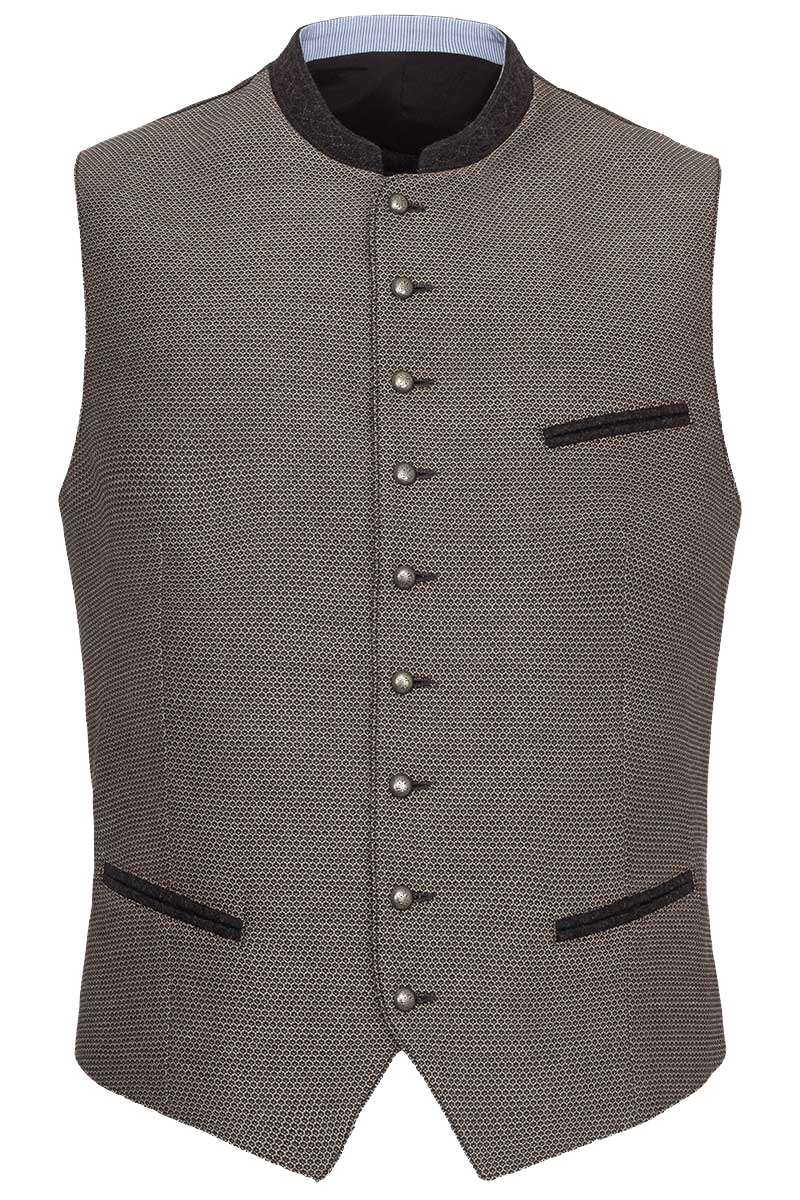 Die graue Trachtenweste MIRKO von Hammerschmid wirkt besonders durch das schöne kleinteilige Muster in schwarz. Die bis zum Stehkragen reichende Knopfleiste ist mit Kugelknöpfen in Altsilber besetzt. Der Rücken ist aus einem fein gestreiften Stretchstoff in grau und schwarz gefertigt. Das rundum eingearbeitete Futter ist in Schwarz ausgeführt. Der Elasthananteil am Rücken, sowie der Slim-Fit-Schnitt gewährleisten eine körperbetonte Silhouette.