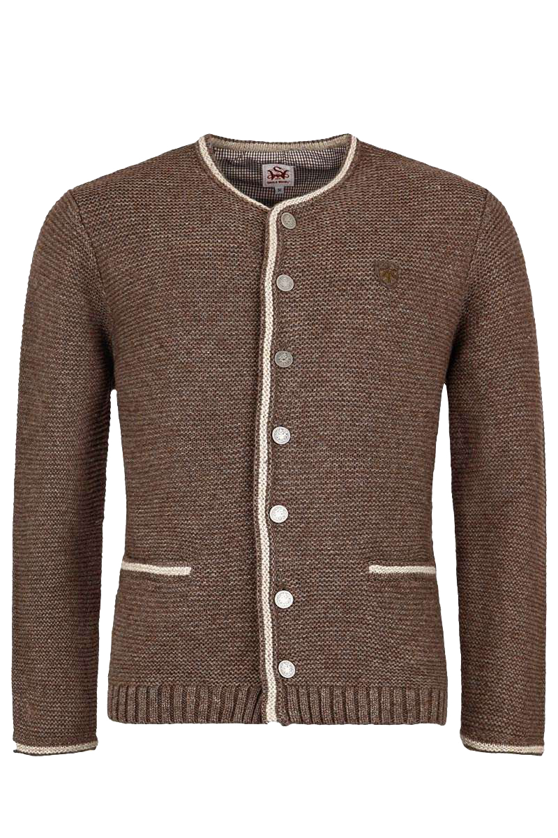 Diese klassische linksgestrickte Herrenjacke der Marke Spieth & Wensky in ist Braun vielseitig kombinierbar. Die Jacke ist schlicht gehalten. Die Abschlüsse der Einschubtaschen, der Ärmel, der Knopfleiste und des Rundhalsausschnittes sind in Beige abgesetzt. Die mittlere Rückennaht ist rechts gestrickt und setzt sich so schön von der links gestrickten Jacke ab. In der Mitte des Rückens ist ein kleines braunes Emblem mit der roten Jahreszahl 1913 angebracht. Am rechten Ärmel ist nahe dem Abschluss ein kleiner, brauner Hirsch eingestickt. Abgerundet wird das harmonische Erscheinungsbild der Jacke durch die grauen, reichlich verzierten Knöpfe.Die Jacke verfügt über einen Rundhalsausschnitt und zwei Einschubtaschen. Geschlossen wird die Jacke vorne mit verzierten Metallknöpfen.