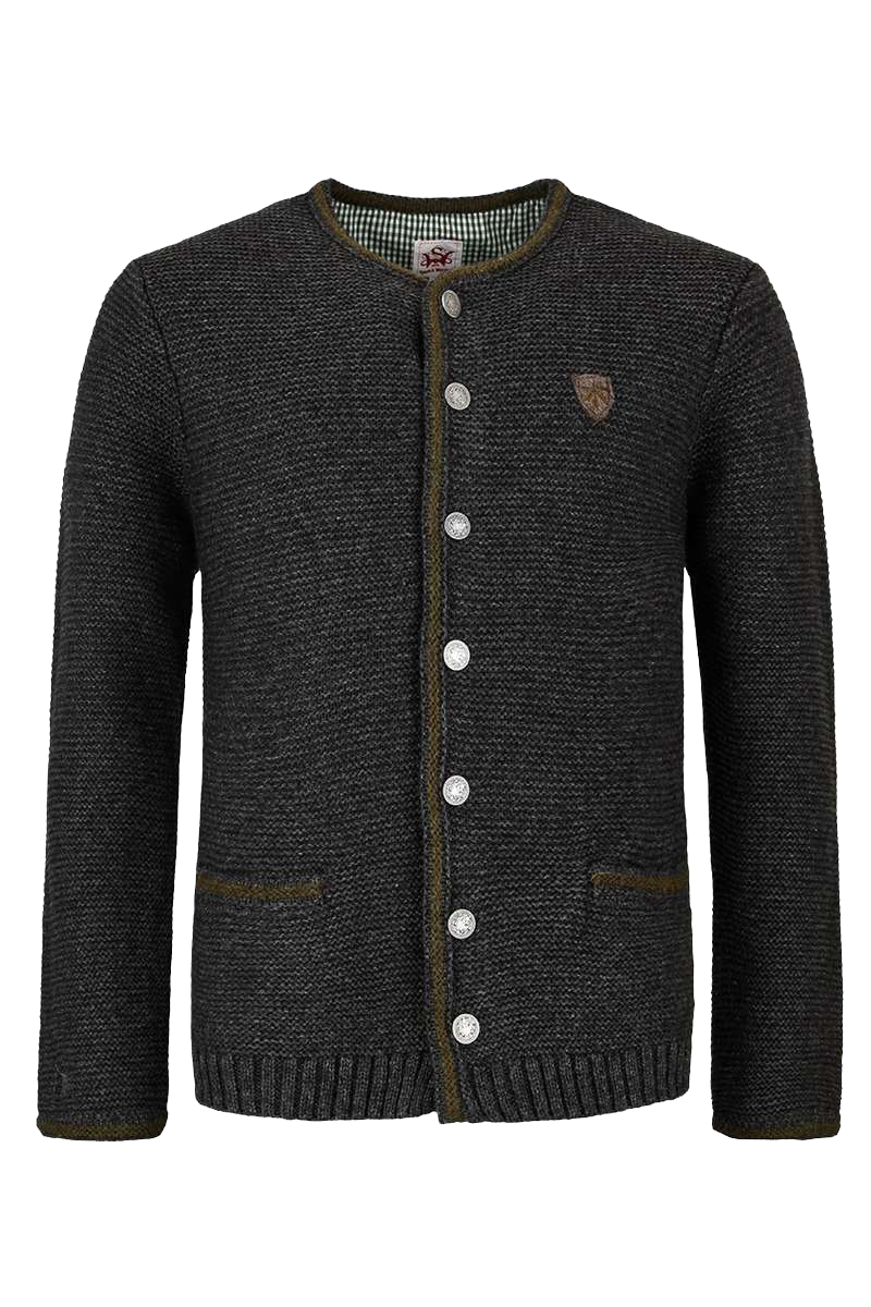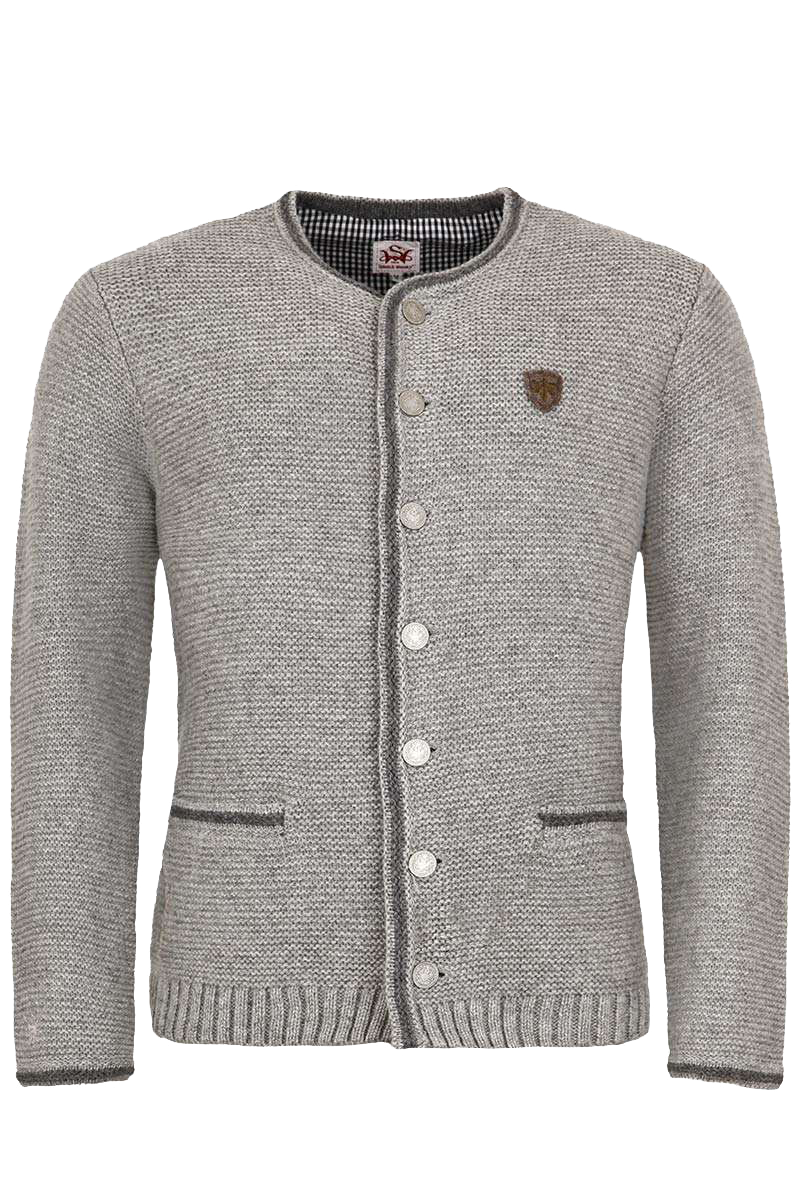 Diese klassische linksgestrickte Herrenjacke der Marke Spieth & Wensky in Grau ist vielseitig kombinierbar. Die Jacke ist schlicht gehalten. Die Abschlüsse der Einschubtaschen, der Ärmel, der Knopfleiste und des Rundhalsausschnittes sind in Dunkelgrau abgesetzt. Die mittlere Rückennaht ist rechts gestrickt und setzt sich so schön von der links gestrickten Jacke ab. In der Mitte des Rückens ist ein kleines braunes Emblem mit der roten Jahreszahl 1913 angebracht. Am rechten Ärmel ist nahe dem Abschluss ein kleiner,grauer Hirsch eingestickt. Abgerundet wird das harmonische Erscheinungsbild der Jacke durch die grauen, reichlich verzierten Knöpfe.Die Jacke verfügt über einen Rundhalsausschnitt und zwei Einschubtaschen. Geschlossen wird die Jacke vorne mit verzierten Metallknöpfen.