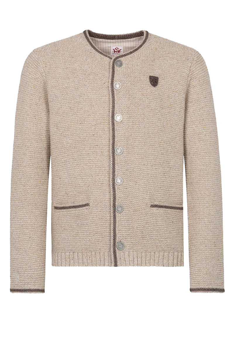 Diese klassische linksgestrickte Herrenjacke der Marke Spieth & Wensky in Beige ist vielseitig kombinierbar. Die Jacke ist schlicht gehalten. Die Abschlüsse der Einschubtaschen, der Ärmel, der Knopfleiste und des Rundhalsausschnittes sind in Braun abgesetzt. Die mittlere Rückennaht ist rechts gestrickt und setzt sich so schön von der links gestrickten Jacke ab. In der Mitte des Rückens ist ein kleines braunes Emblem mit der roten Jahreszahl 1913 angebracht. Am rechten Ärmel ist nahe dem Abschluss ein kleiner, beiger Hirsch eingestickt. Abgerundet wird das harmonische Erscheinungsbild der Jacke durch die grauen, reichlich verzierten Knöpfe.Die Jacke verfügt über einen Rundhalsausschnitt und zwei Einschubtaschen. Geschlossen wird die Jacke vorne mit verzierten Metallknöpfen.