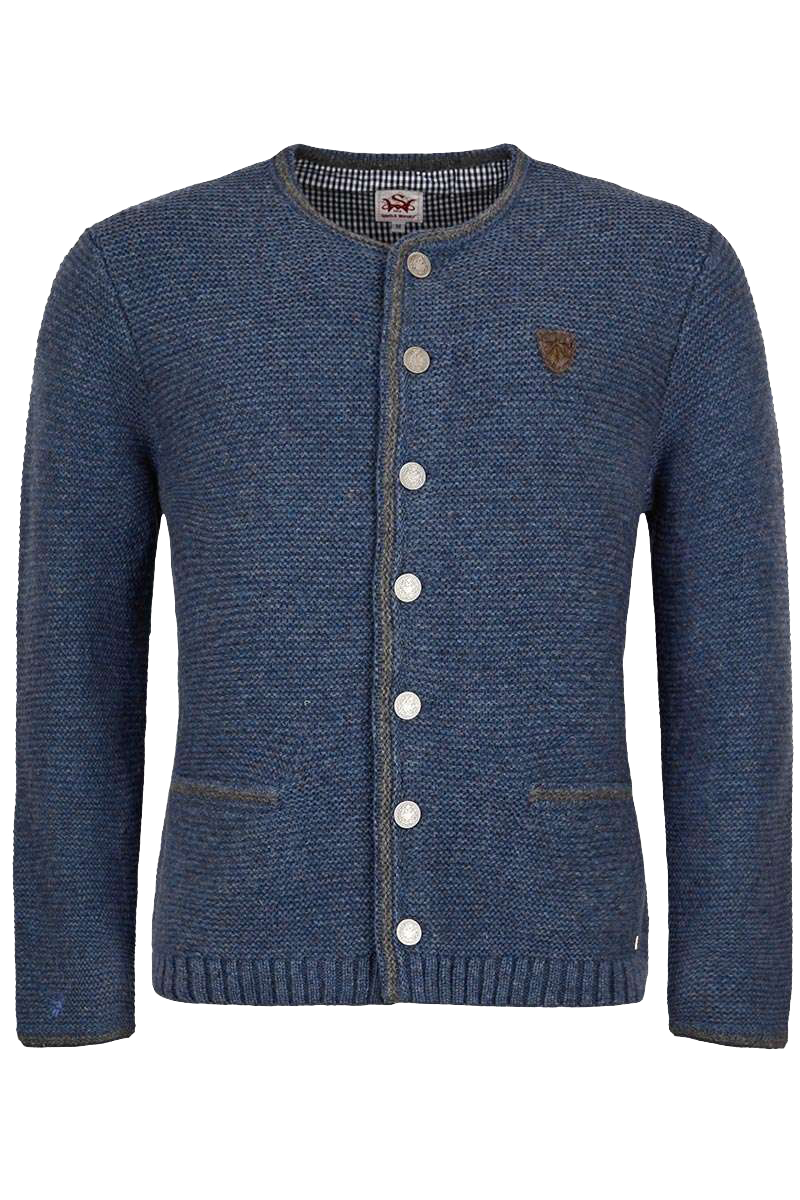 Diese klassische linksgestrickte Herrenjacke der Marke Spieth & Wensky in Jeansblau ist vielseitig kombinierbar. Die Jacke ist schlicht gehalten. Die Abschlüsse der Einschubtaschen, der Ärmel, der Knopfleiste und des Rundhalsausschnittes sind in Dunkelgrau abgesetzt. Die mittlere Rückennaht ist rechts gestrickt und setzt sich so schön von der links gestrickten Jacke ab. In der Mitte des Rückens ist ein kleines braunes Emblem mit der roten Jahreszahl 1913 angebracht. Am rechten Ärmel ist nahe dem Abschluss ein kleiner,grauer Hirsch eingestickt. Abgerundet wird das harmonische Erscheinungsbild der Jacke durch die grauen, reichlich verzierten Knöpfe.Die Jacke verfügt über einen Rundhalsausschnitt und zwei Einschubtaschen. Geschlossen wird die Jacke vorne mit verzierten Metallknöpfen.