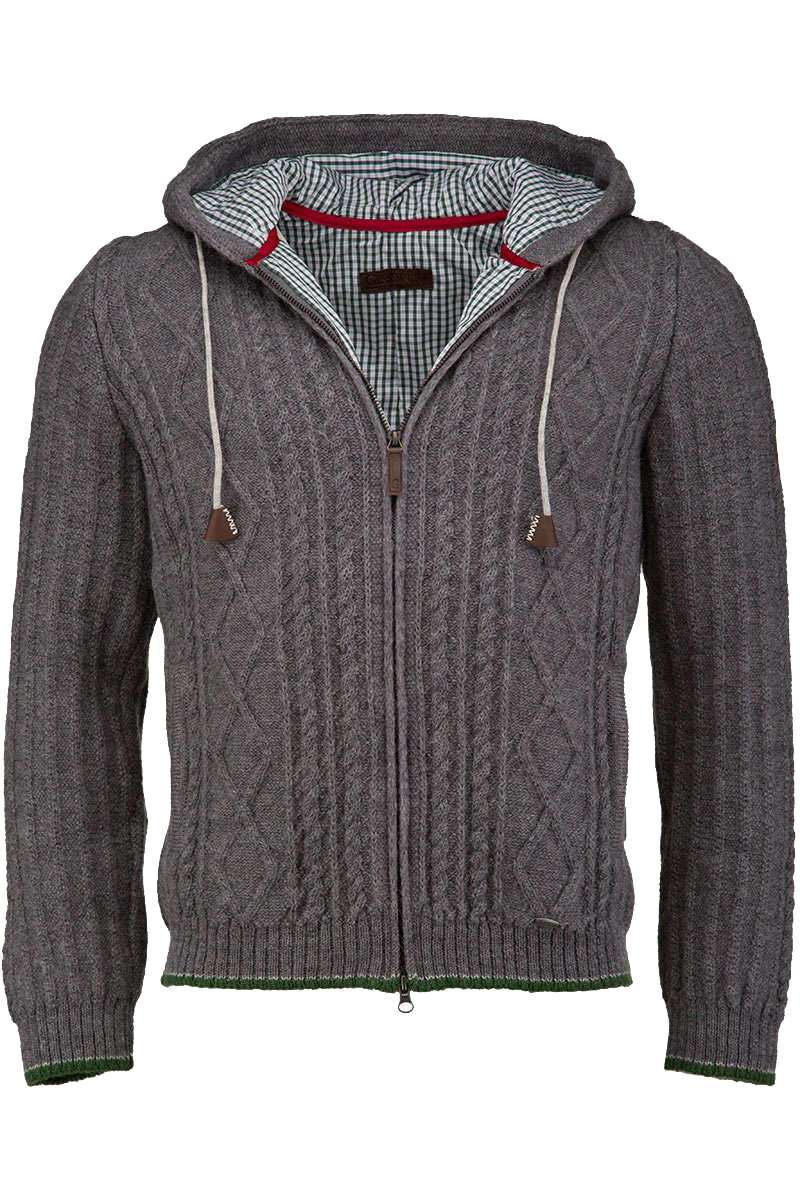 Diese tolle und modische Strickjacke von Giesswein besticht durch die vielen aufwendig gestalteten Details der Jacke. Die Jacke verfügt über eine linksgestrickte Kapuze. Die Vorderseite der Jacke ist mit aufwendigen Mustern im Wechsel bestickt. Das Grundmuster ist linksgestrickt, darauf befinden sich kleine Zopfmuster und ein großes Rautenmuster die in rechts gestrickt sind. Auch auf den Ärmeln sind solche Muster wieder zu finden. Der Rücken der Jacke und die Ärmel sind auch auf links gestrickt. Auf diesem links gestrickten Grundmuster sind in regelmäßigen Abständen Streifen eingearbeitet die auf rechts gestrickt sind. Die Jacke verfügt über zwei Einschubtaschen. Geschlossen wird die Jacke vorne mit einem Reißverschluss. Am Bund der Jacke und an den Ärmelabschlüssen sind Ziernähte aus hellgrauer und aus grüner Wolle angebracht. Das Innenfutter der Jacke aus weiß-grün kariertem Stoff und gewährleistet einen hohen Tragekomfort. Auf dem linken Ärmel ist ein Emblem aus Leder angebracht.