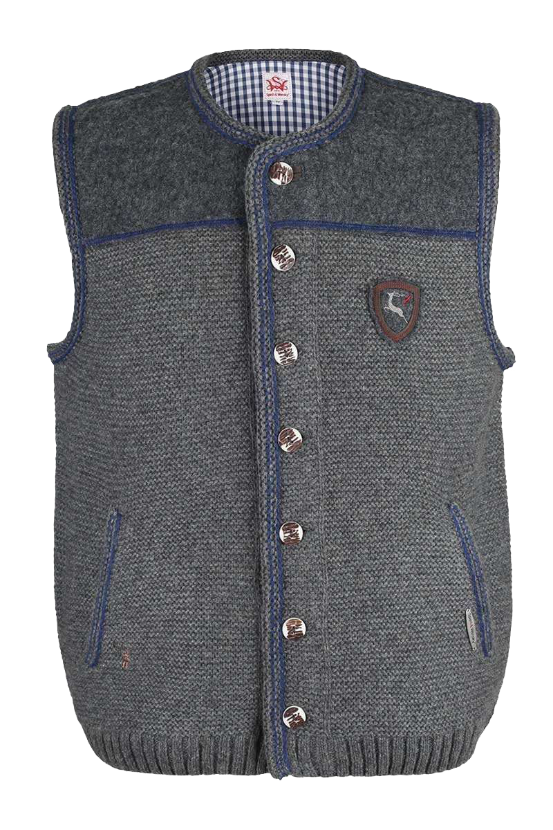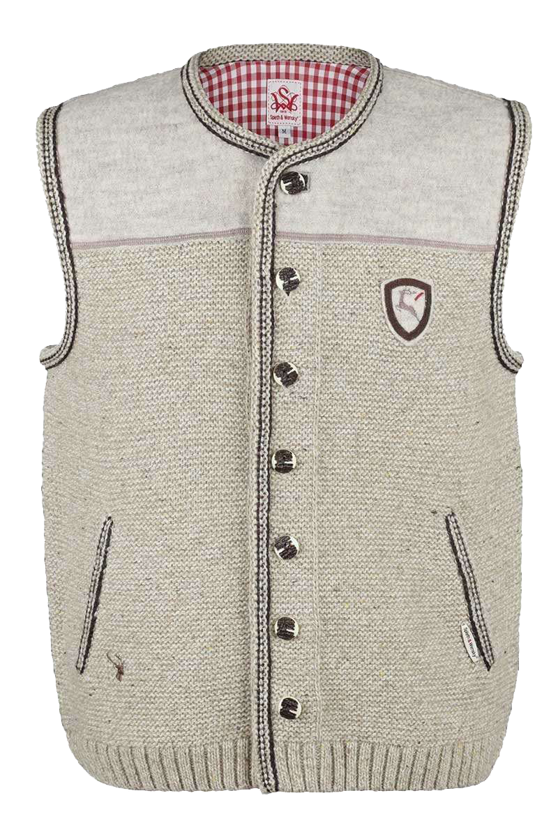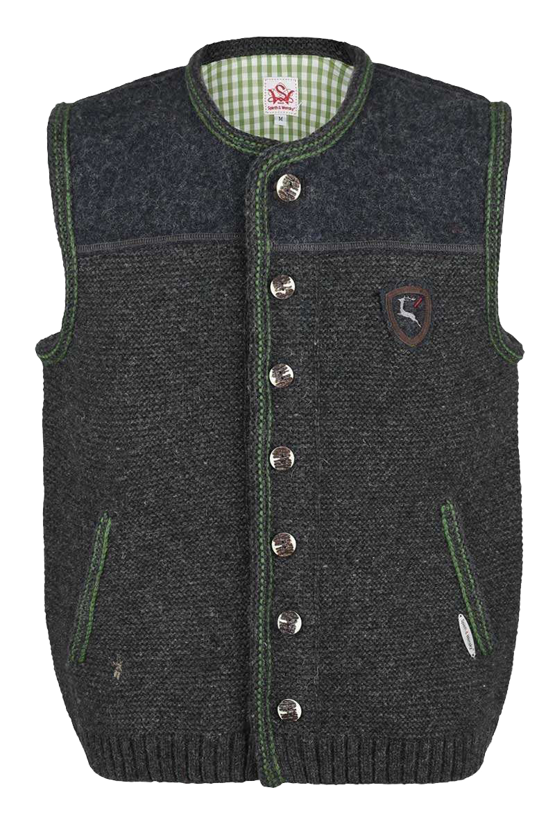 Modische Herrenstrickweste mit Hirschwappen-Applikationen auf der rechten Brust und auf der Rückseite. Der Schultersattel aus hellbraunem Walkstoff in Kombination mit der links-gestrickten dunkelbraunen Wolle verleiht der Weste einen besonderen Look. Ausgestattet ist die Weste mit zwei Einschubtaschen auf den Seiten. Unterhalb der linken Einschubtasche ist dezent ein Hirschkopf eingestickt. Die rot abgesetzten Nähte lockern das Erscheinungsbild der Weste auf.