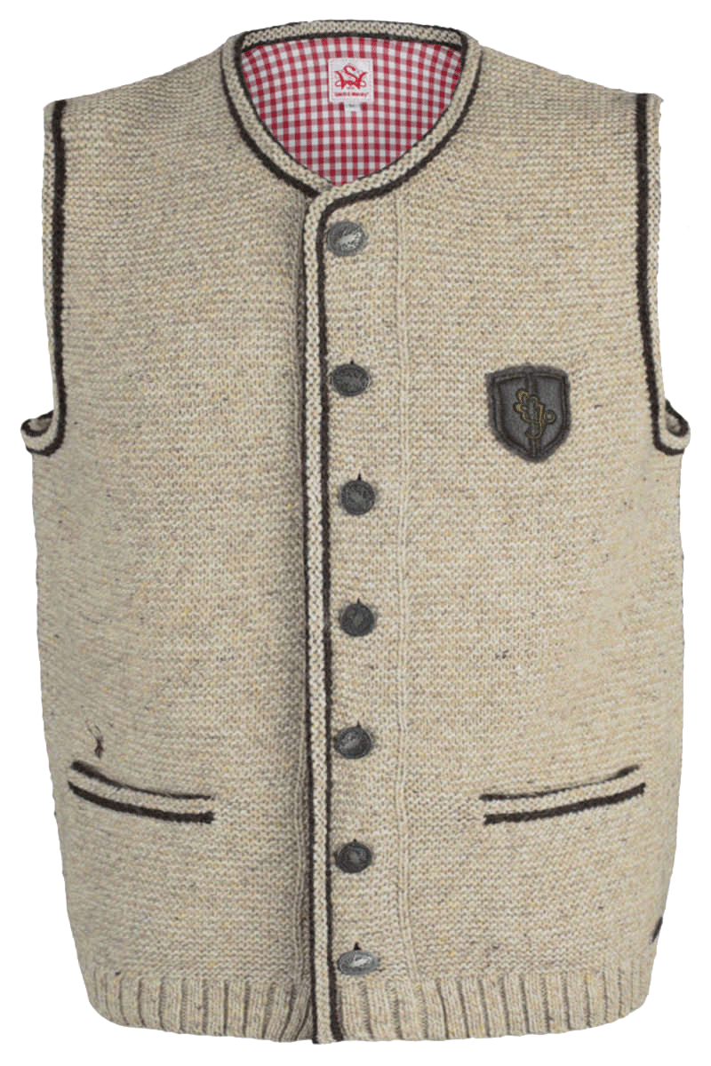 Modische und klassische linksgestrickte Herrenweste in Naturfarben mit rot/weiß kariertem Innenfutter am Halsausschnitt, sowie einem abgesetztem Strickbund. An der Knopfleiste und dem Kragen, den Einschubtaschen und den Ärmelausschnitten sind farblich abgesetzte Zierpaspeln in Dunkelbraun angebracht. Zudem hat die Weste eine abgesetzte, rechtsgestrickte Rückennaht. Ausgestattet ist die Weste mit zwei Einschubtaschen auf den Seiten. Oberhalb der rechten Tasche ist ein kleiner Hirschkopf eingestickt. Unterhalb der linken Einschubtasche ist das Spieth & Wensky Emblem angebracht und auf der linken Brust befindet sich ein braunes Emblem mit eingesticktem Eichelblatt und einer Eichel. Ein ähnliches Emblem findet sich auf der Rückseite der Weste wieder. Abgerundet wird das harmonische Erscheinungsbild der Weste durch die grauen, reichlich verzierten Knöpfe.