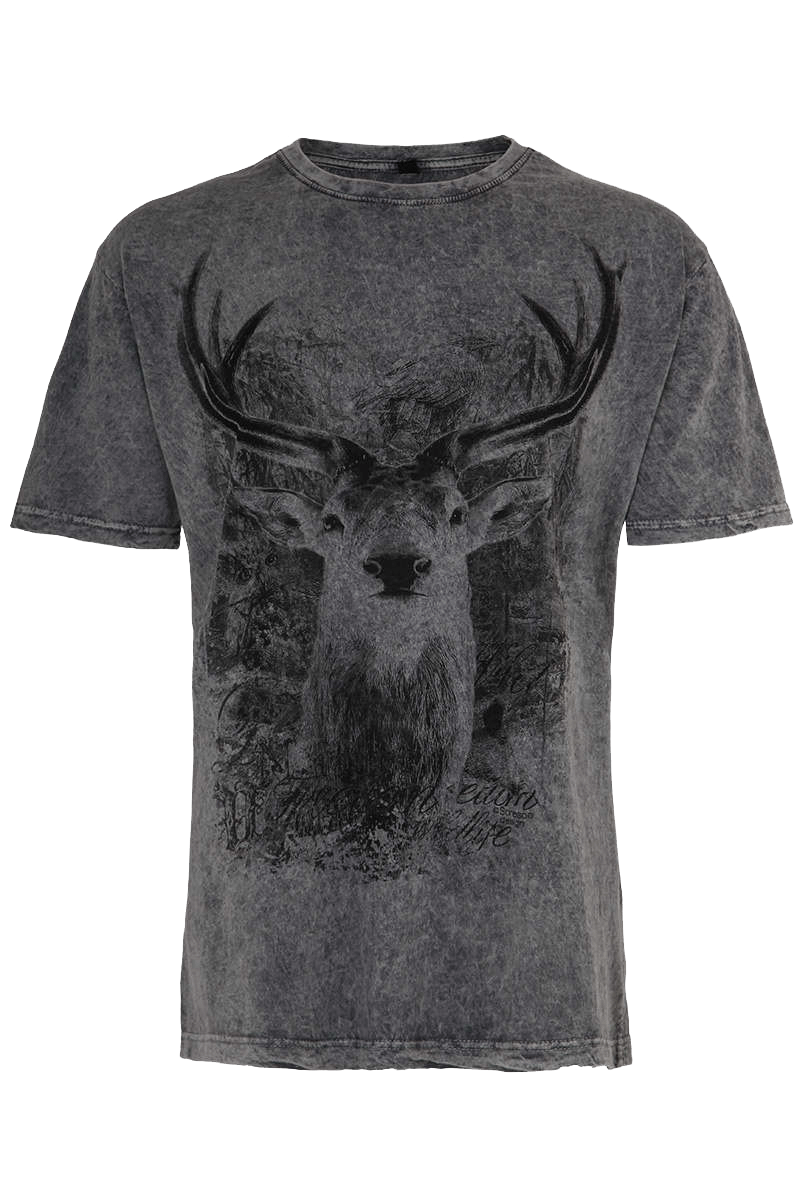 Ein prächtiger Hirsch beherrscht die Wildszenerie auf der Brust dieses lässig weit geschnittenen Shirts in Grau. Umrahmt wird der stolze Herr des Waldes von weiteren Wildtieren wie Raubvögel, Reh und Wildschwein. Das sommerlich leichte Shirt lässt sich ideal zu einer Jeans kombinieren.