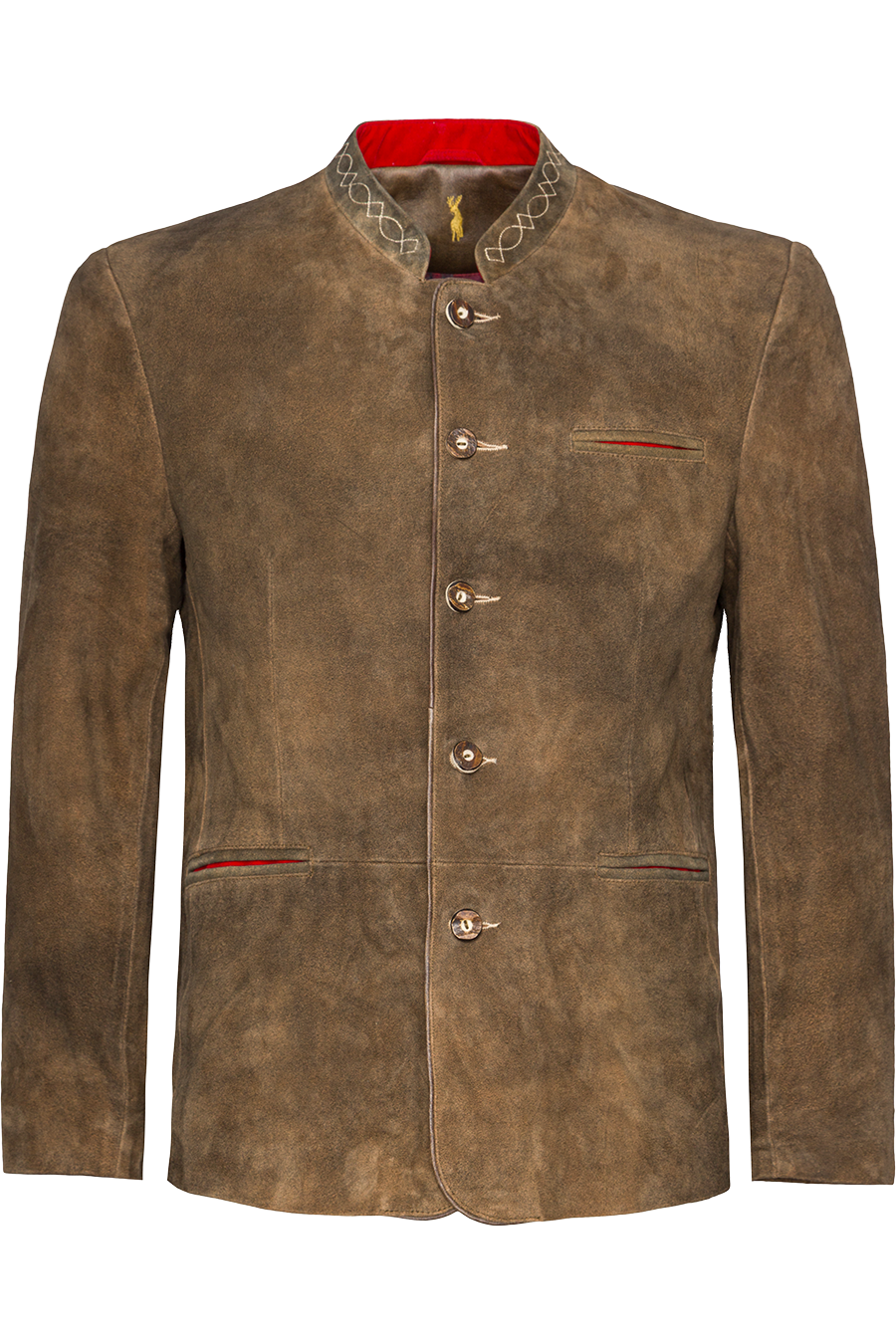 Ein besonderes Highlight ist das aufwendig gearbeitete Innenfutter mit mehrfarbigem Karomuster und liebevollen Hirschmotiven, das die Verbundenheit zur alpenländischen Tradition charmant widerspiegelt. Der Stehkragen ist mit einer dezenten, kontrastfarbigen Stickerei verziert und setzt einen eleganten Akzent. Dank der Rückenpasse bietet die Jacke optimale Bewegungsfreiheit und einen angenehmen Tragekomfort.