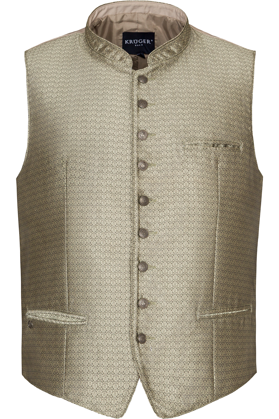 Die Herren-Trachtenweste von Krüger überzeugt mit ihrem stilvollen, floralen Webmuster und dem klassischen Stehkragen. Die hochschließende Knopfleiste mit verzierten Knöpfen verleiht der Weste einen traditionellen Charakter.