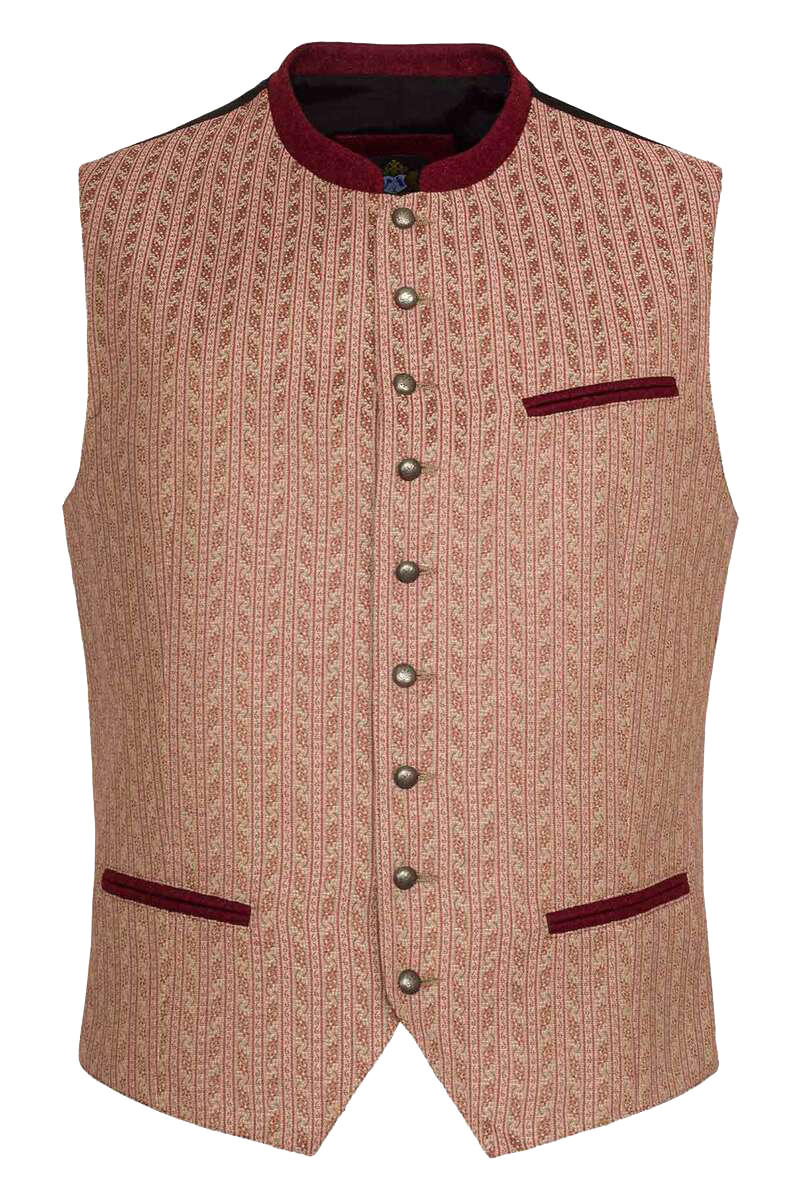 Die Trachtenweste Caspar ist eine edle rote Trachtenweste für Herren der Marke Hammerschmid in Slim-Fit-Passform. Das rote Obermaterial ist auf der Vorderseite mit einem Blumenrankenmuster und Streifen verziert. Die beiden vorderen Einschubtaschen und die Brusttasche sind mit farblich abgestimmter roter Filzpaspel eingefasst. Auch der Stehkragen ist mit Filz gearbeitet. Die altsilberfarbenen Kugelknöpfe runden das traditionelle Design ab.Die Weste ist auf der Rückseite klassisch schwarz und innen vollständig gefüttert Der Rücken mit 98% Baumwolle und 2% Elasthan versprechen einen optimalen Fit. Die Weite des Stretch-Rücken kann durch einen so genannten Dragoner am Rücken reguliert werden.