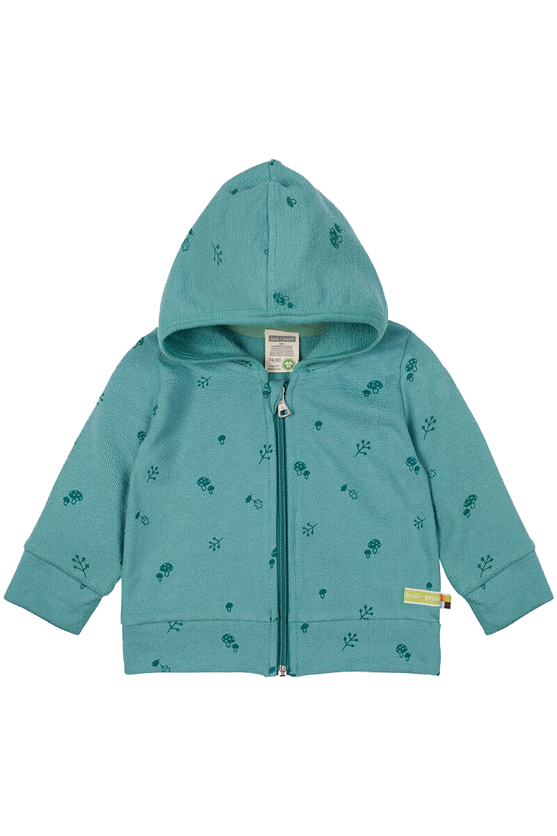 Dieses hübsche türkisgrüne Baby- und Kleinkinder-Jäckchen mit Kapuze und Reißverschluss der Marke Loud&Proud ist aus weichem Baumwolljersey (GOTS-zertifiziert) gefertigt und äußerst vielseitig kombinierbar.Der Stoff besitzt ein niedliches dunkelgrünes Natur-Muster mit kleinen Pilzen und Zweigen. Die Ärmel schließen mit einem bequemen breiten Jersey-Bündchen ab. Der Reißverschluss ist aus dunklerem Grün, was einen schönen Kontrast bildet.Die Jacke fällt groß aus.