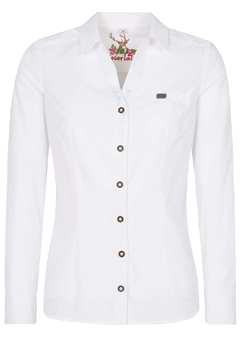 Diese süße, weiße Bluse der Marke Spieth & Wensky verfügt über ein paar niedliche Details. Die langen Ärmel sind am Abschluss mit Knöpfen in Hirschhornoptik versehen. Dieselben Knöpfe finden sich in der Knopfleiste vorne an der Bluse wieder, die mit einer schicken weißen Stickerei aufgepeppt wurde. Auf der Brusttasche ist ein kleines Metall-Emblem mit den Initialen S und W angenäht.Die Abnäher der Bluse garantieren einen taillierten Sitz. Die Bluse ist mit einem klassischen Kragen ausgestattet. Zudem verfügt die Bluse über eine Brusttasche.