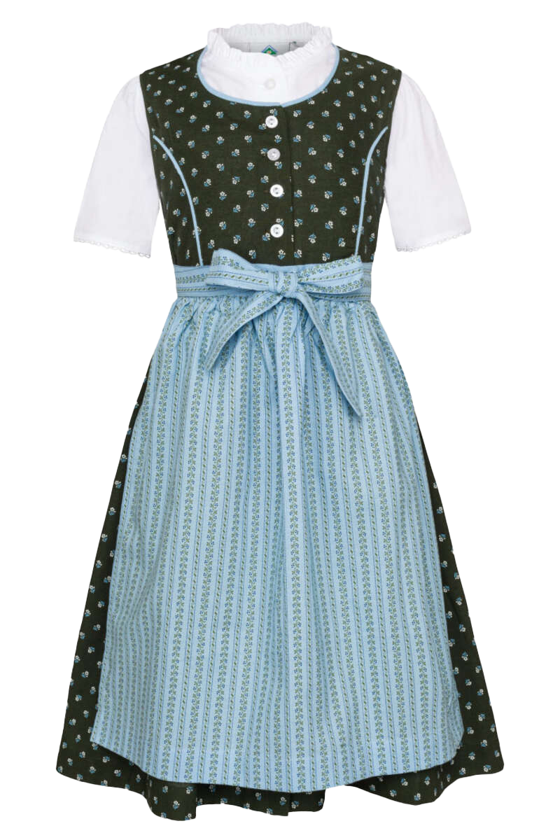 Dieses bezaubernde Kinderdirndl von Isar-Trachten in Tannengrün und Blau ist im traditionellen Stil gehalten und lässt sich zu vielen verschiedenen Anlässen tragen. Der Rundhalsausschnitt und die zwei Wiener Nähte wiederholen den frischen Blauton der Schürze. Das klassische Blumenmuster in Weiß und Blau auf dem Oberteil und Rock verleiht dem Dirndl einen lebhaften Look. Geschlossen wird das Dirndl mit hellen Knöpfen in Perlmuttfarben, an denen auch die Schürze befestigt wird und somit ein perfekter Halt garantiert wird. Sowohl Dirndl als auch die Schürze sind aus reiner Baumwolle und deshalb sehr angenehm zu tragen. Zum Dirndl gehört eine Bluse mit Rundhalsausschnitt, die besonders süß durch die eingearbeitete Faltenlegung wirkt. An den Ärmeln der Bluse ist eine niedliche Spitzenborte in Zackenform eingearbeitet. Die Bluse wird mit Knöpfen, die sich mittig an der Vorderseite befinden, geschlossen.