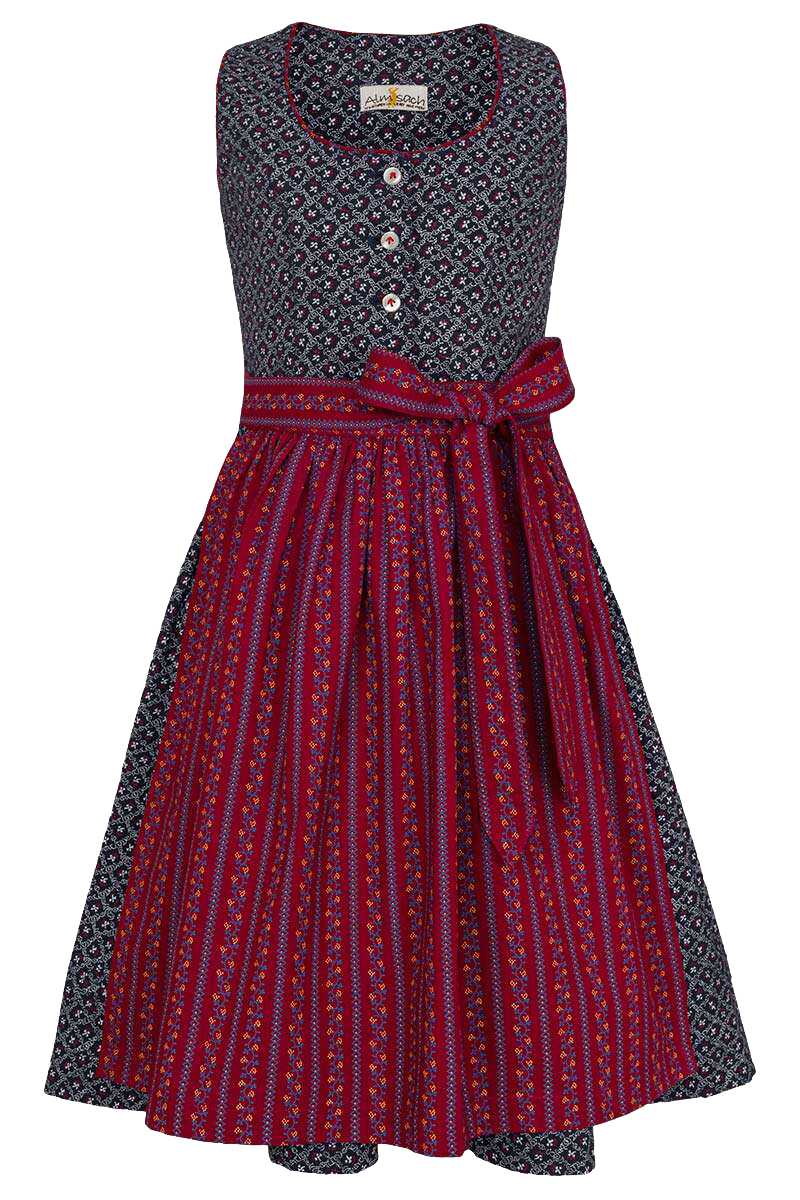 Dieses hübsche, traditionelle Kinderdirndl aus reiner Baumwolle macht Ihre Tochter zur kleinen Trachtlerin. Das Dirndl von Almsach ist liebevoll mit einem Streublumenmuster gestaltet und ist auch für Damen erhältlich, sodass es wunderbar im Partnerlook getragen werden kann.Der Rundhalsausschnitt ist mit einer roten Paspel eingefasst. Die Knopfleiste auf der Vorderseite des Oberteils ist mit perlmuttfarbenen Knöpfen versehen. Traditionell ist das Dirndl mit Wiener Nähten versehen, die für eine schöne Passform sorgen. Der Rock ist ebenfalls dunkelblau und mit einem hübschen Streublumenmuster verziert.Die rote Baumwollschürze verleiht dem Dirndl einen farbenfrohen Charakter und harmoniert mit dem gelb-blauen Streublumenmuster zu einem traditionellen Design. Das Dirndl aus reiner Baumwolle ist pflegeleicht und langlebig. Der Stoff ist angenehm zu tragen, kratzt nicht und ist sehr atmungsaktiv und temperaturausgleichend, was besonders an warmen Tagen von Vorteil ist.Die Rocklänge in Größe 110 beträgt ca. 42 cm.
