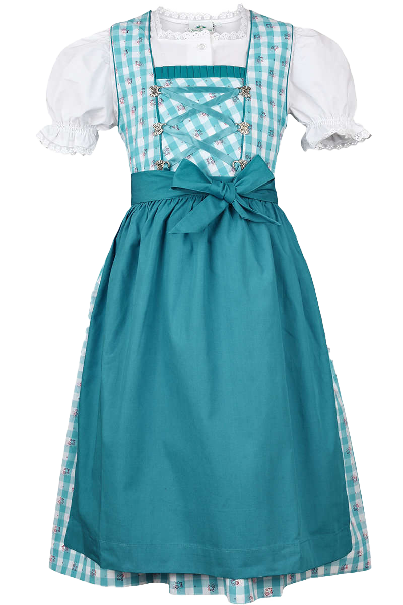 Dieses süße Dirndl der Marke Isar Trachten ist für jeden kleinen Trachtenfan die richtige Wahl. Das Oberteil und der Rock des Dirndls sind mit kleinen Karos in Türkis und Weiß geschmückt. Die Ärmelabschlüsse und Zierstreifen am Oberteil sind aus türkisem Stoff gearbeitet. Am Ausschnitt ist eine türkise Rüschenbordüre angebracht. Die Zierschnürung ist aus türkisen Bändern gearbeitet und verläuft in kleinen, metallenen Miederhacken. Das Dirndl wird hinten mit einem Reißverschluss geschlossen.