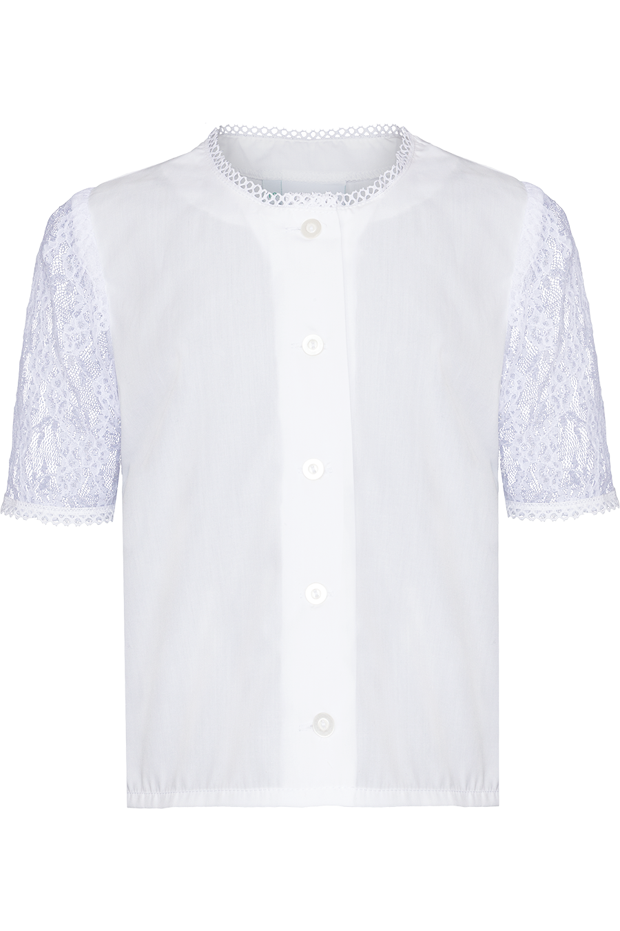 Diese niedliche Kurzarmbluse für Kinder von der Marke Isar-Trachten ist die perfekte Ergänzung zum Dirndl und begeistert mit zarten Details. Der runde Halsausschnitt ist mit einer feinen Spitzenborte verziert – ebenso wie die leicht transparenten Ärmel aus wunderschöner Blumenspitze, die der Bluse eine verspielte, festliche Note verleihen.